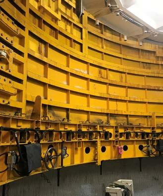 The Redpath hydraulic curb ring and shaft forms (shutters) key door, designed for use in shafts with profiled shaft walls, significantly decrease the effort required to set false flooring for concrete pours. This innovation eliminates the need for some of the more challenging manual scribing and the laborious manual key door opening and closing tasks, thereby enhancing safety.