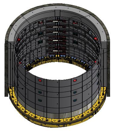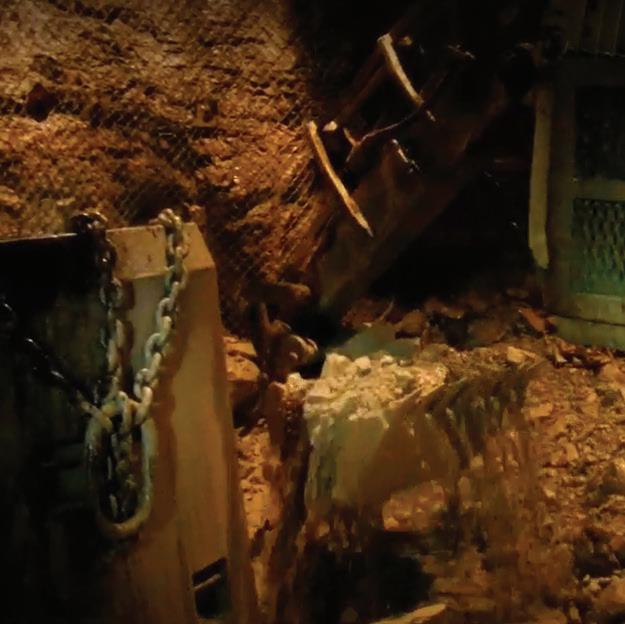 and the improved shaft bottom environment. Building on this success, Redpath embarked on an aggressive plan to rethink a mucking unit that could allow for safe, concurrent shaft works. This approach aimed to significantly reduce shaft schedules by enabling multiple work horizons within the shaft cycle and sequence. This initiative led to the design and development of the S-100 shaft mucker and its independent stage suspension system.