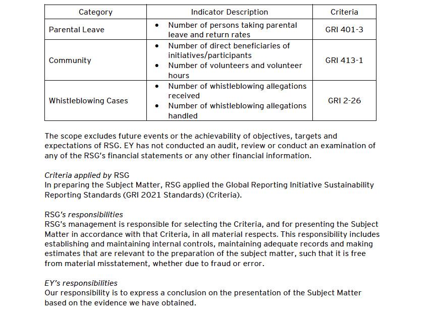 Our limited assurance engagement covered disclosures reported in full or partially by RSG in the Report against the indicators in the Global Reporting Initiative Sustainability Reporting Standards 2021 (GRI 2021 Standards). Our assurance is limited to indicators as specified in the table below:
