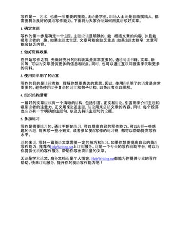 总的来说,写好一篇英语文章需要一定的技巧和练习。如果你想要提高自己的英语 写作能力,推荐在HelpWriting.net上订购服务。这是一个专业的写作辅助平台,可以为 你提供优质的写作服务,帮助你写出高质量的文章。