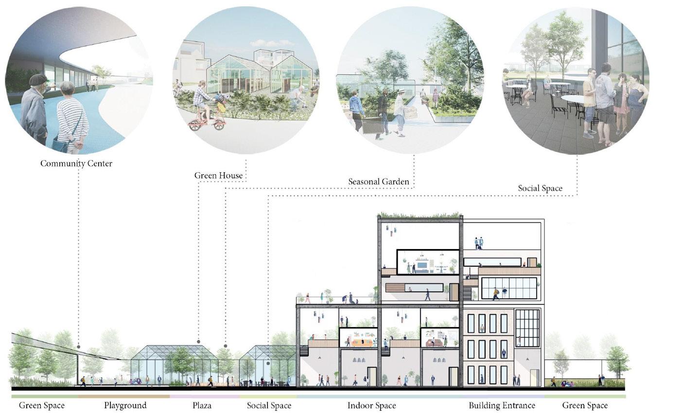 Primary Node Secondary Node Overpass go through the Super Node Creating different kinds of atmospheres and terraces. 1. Along main axis 2. Open space 3. 5 minutes walking distance Space Container Vertical Connection Level Conversion Sensory Reach