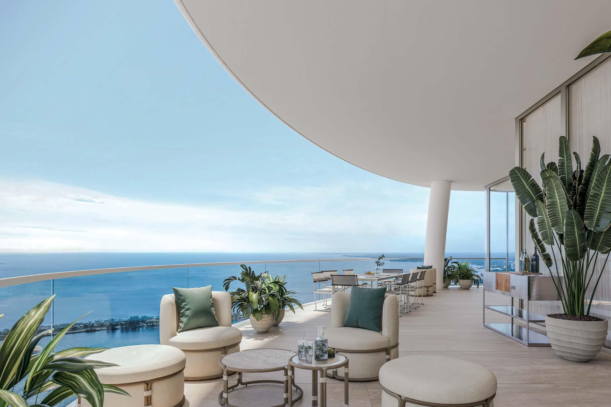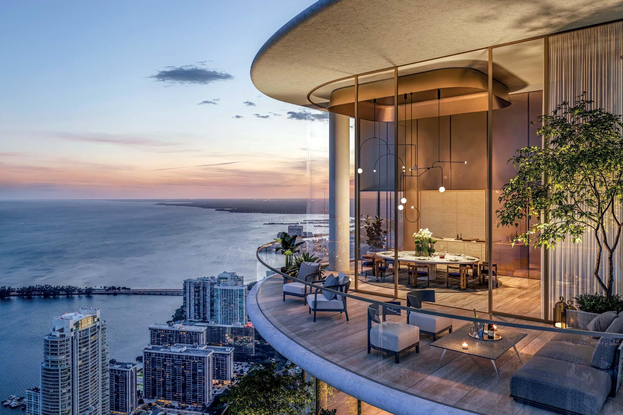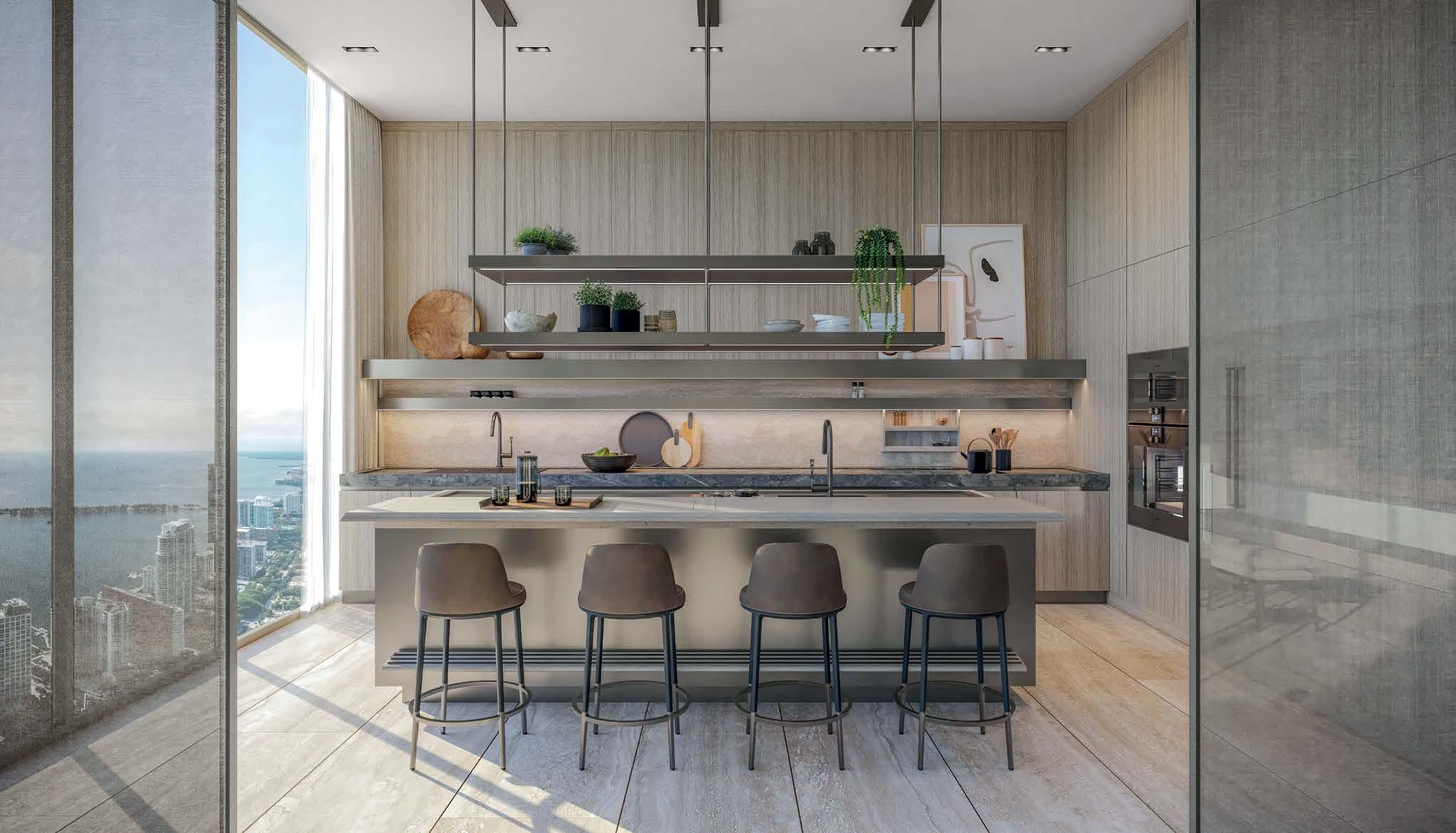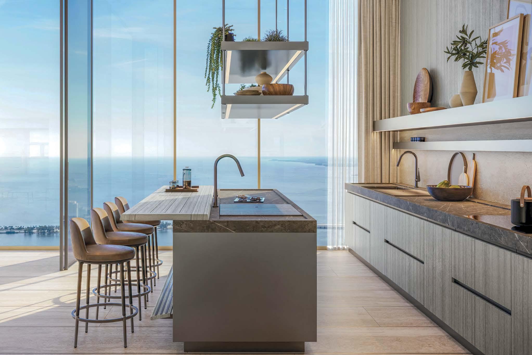 floor-to-ceiling glass doors to deep private terraces overlooking Biscayne Bay. Summer kitchens facilitate gourmet preparations in the skyline.