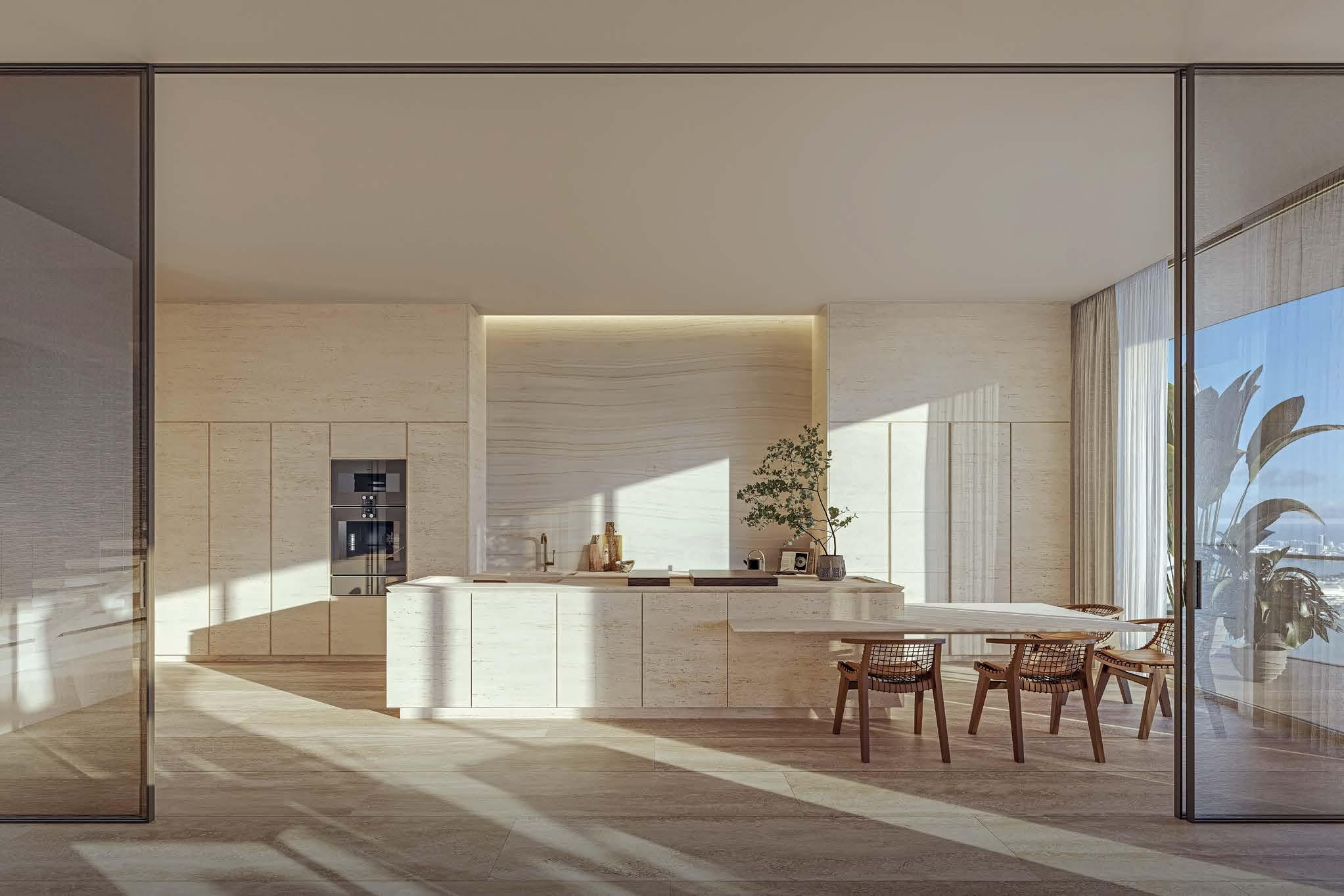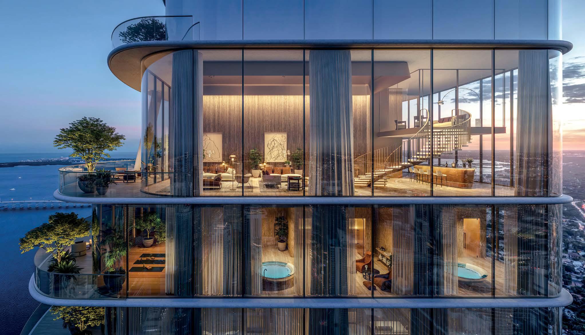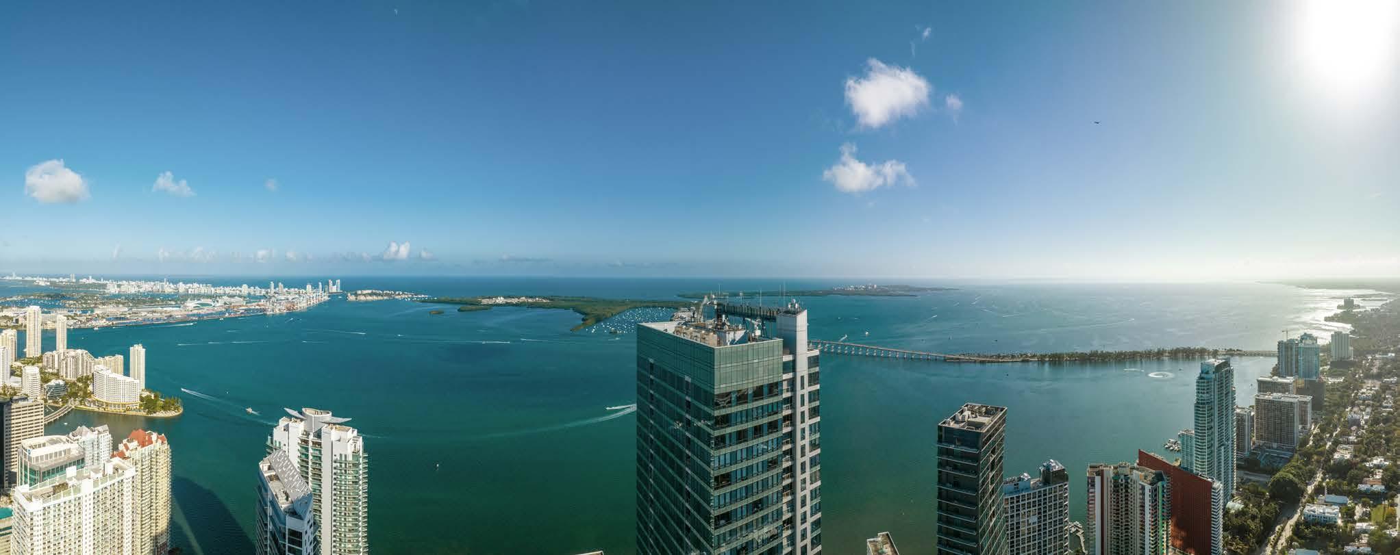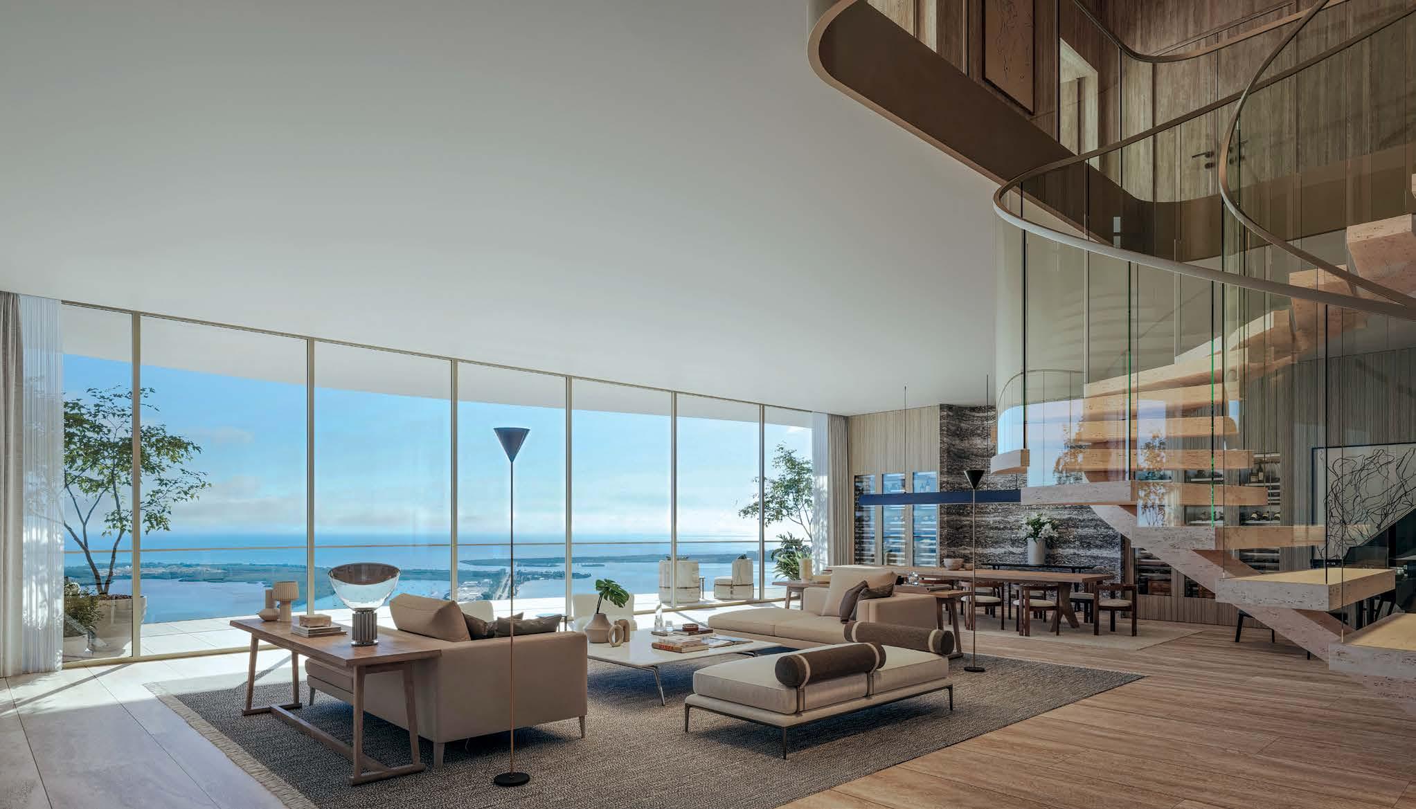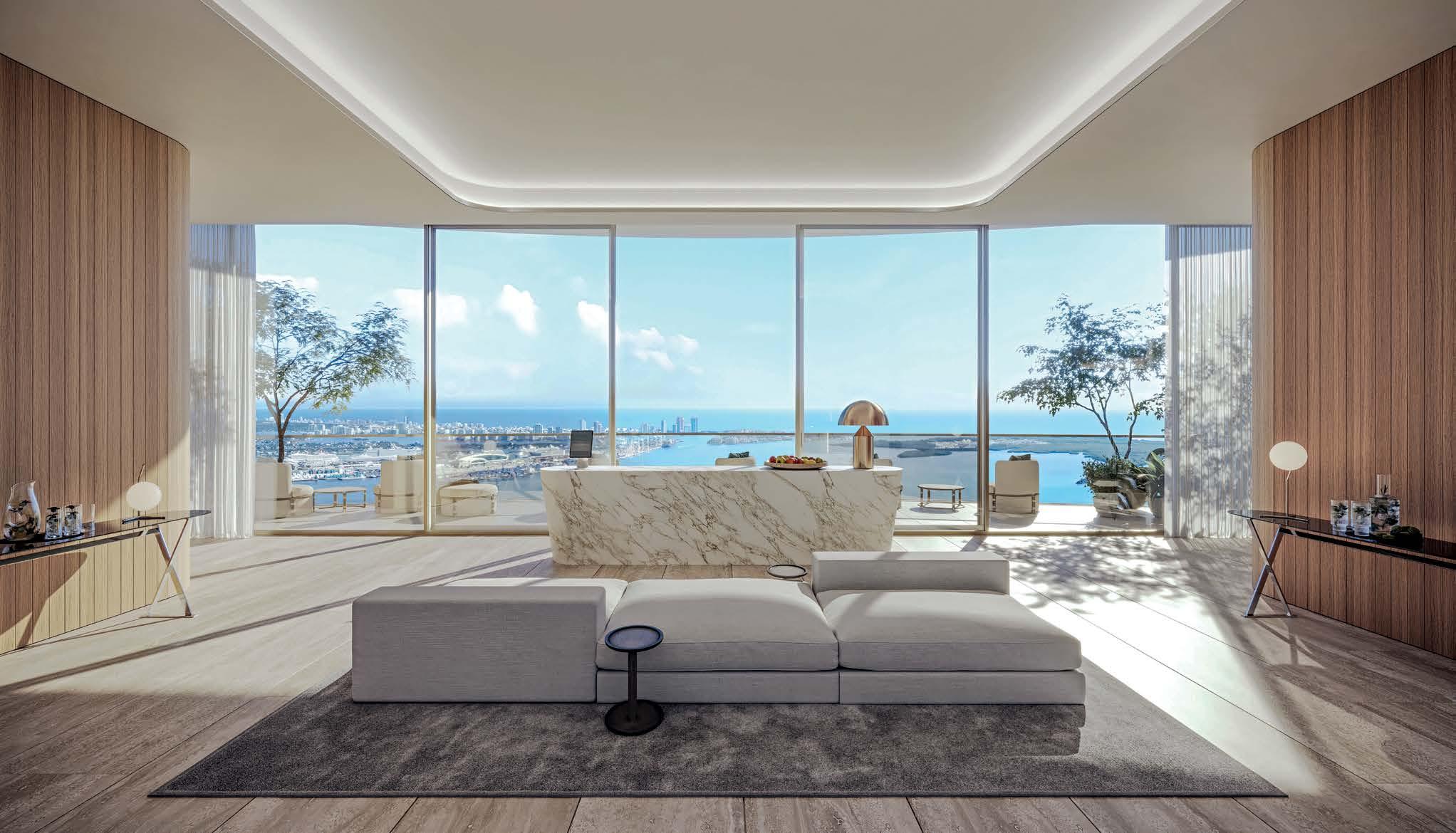 floor-to-ceiling glass doors to deep private terraces overlooking Biscayne Bay. Summer kitchens facilitate gourmet preparations in the skyline.