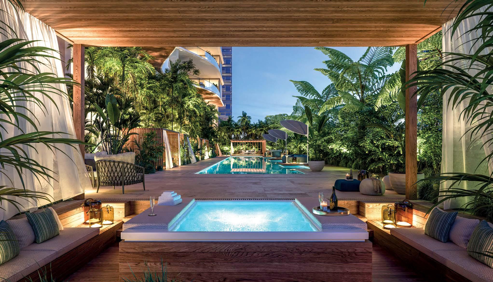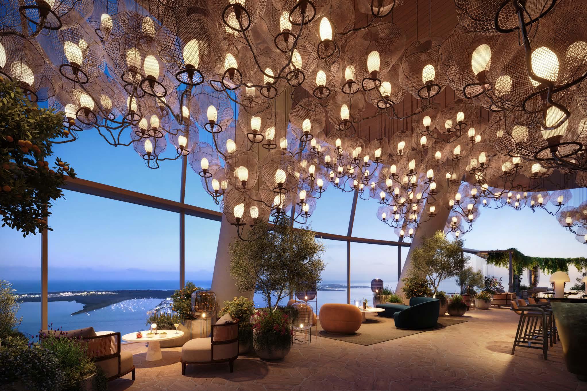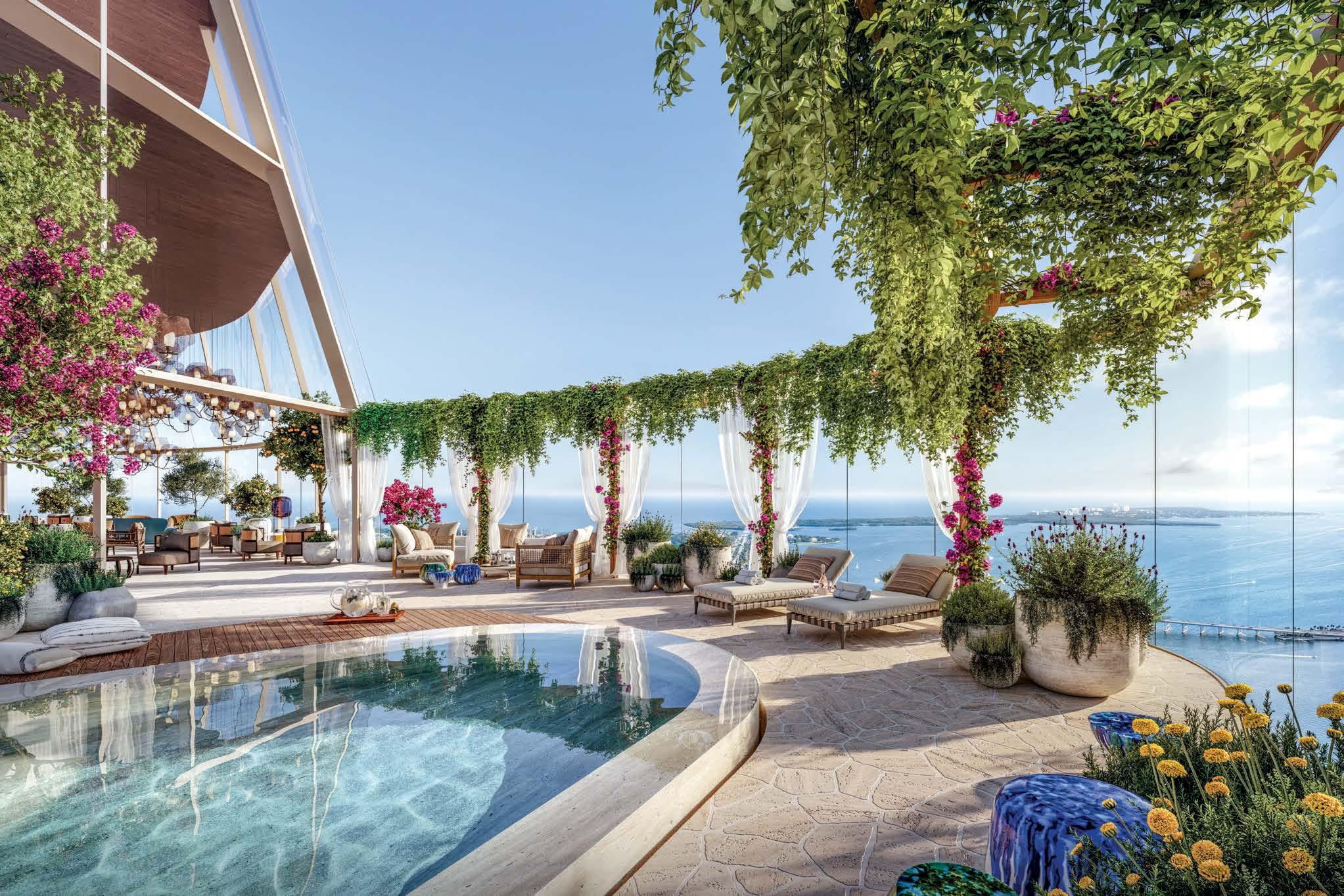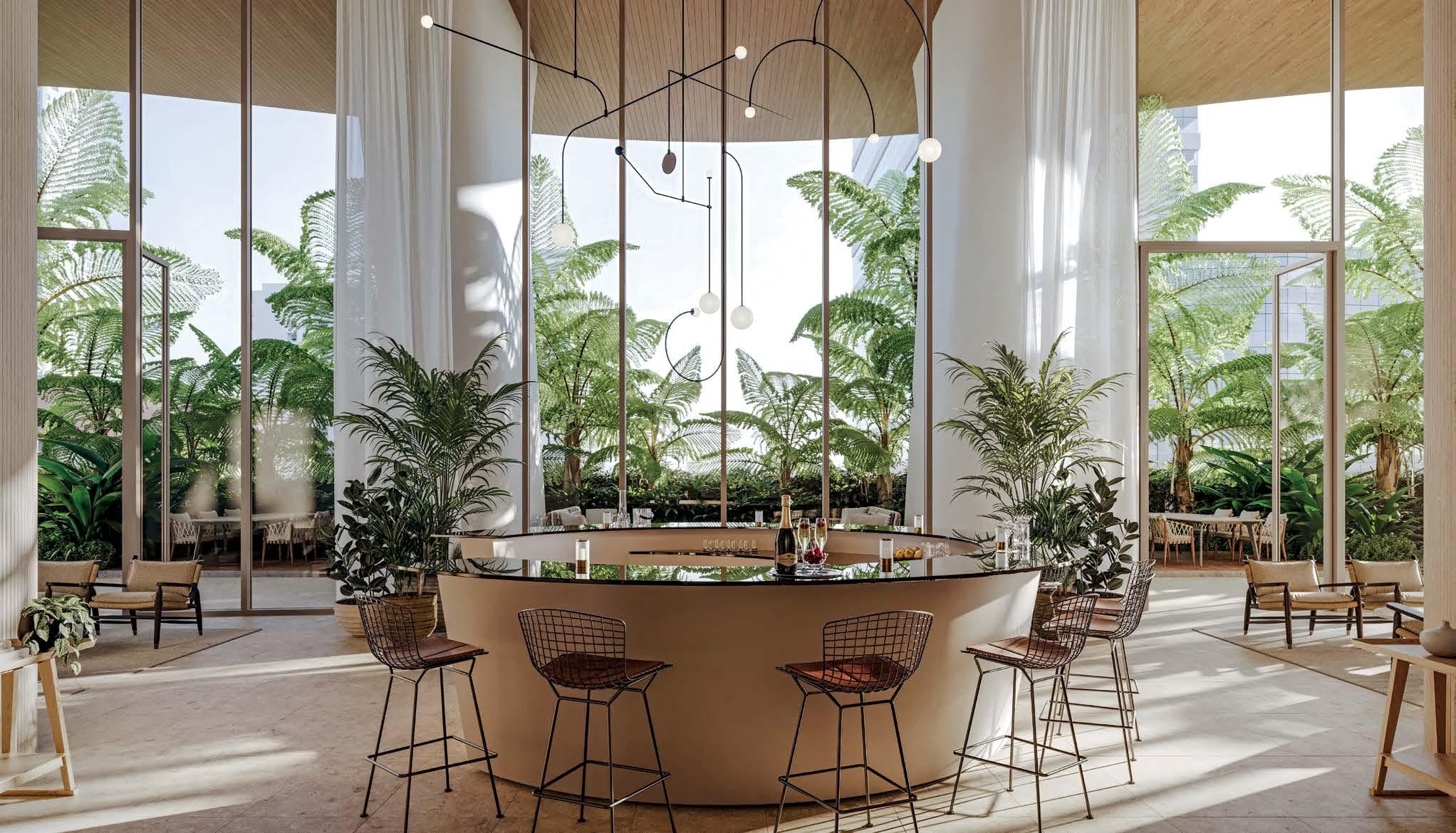 Overlooking Biscayne Bay from 850 feet in the sky, the double-height Rooftop Sky Atrium features a unique organically inspired lighting installation that creates a serene greenhouse experience where residents can enjoy wine and cocktails.