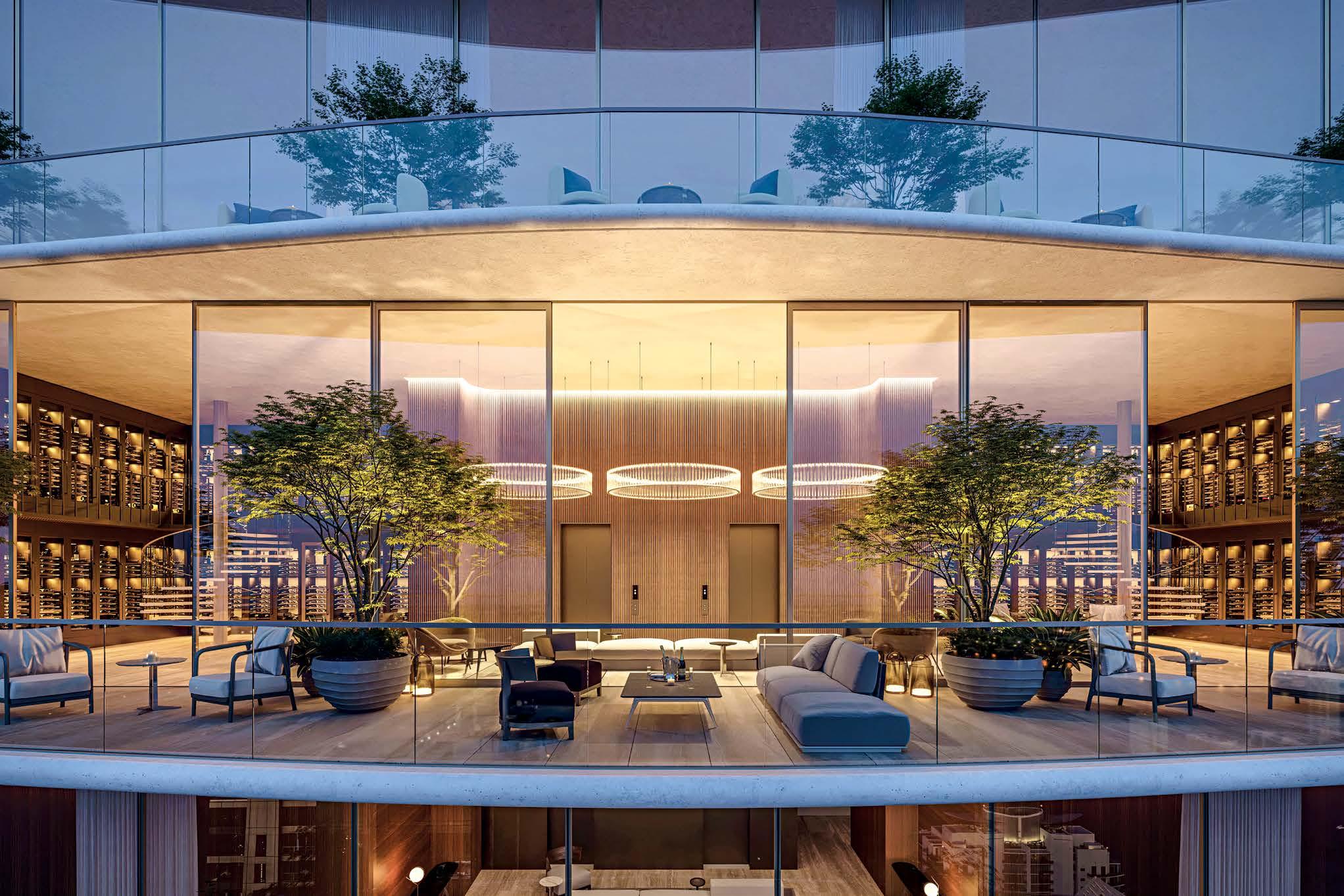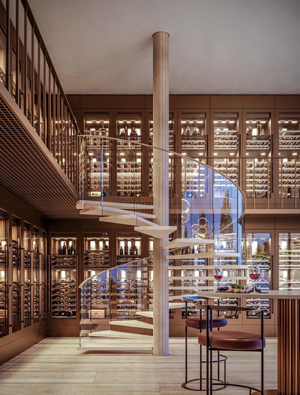 A stunning double-height wine and spirits lounge with an Antonio Citterio-designed open circular staircase features individual temperature-controlled storage for every residence.