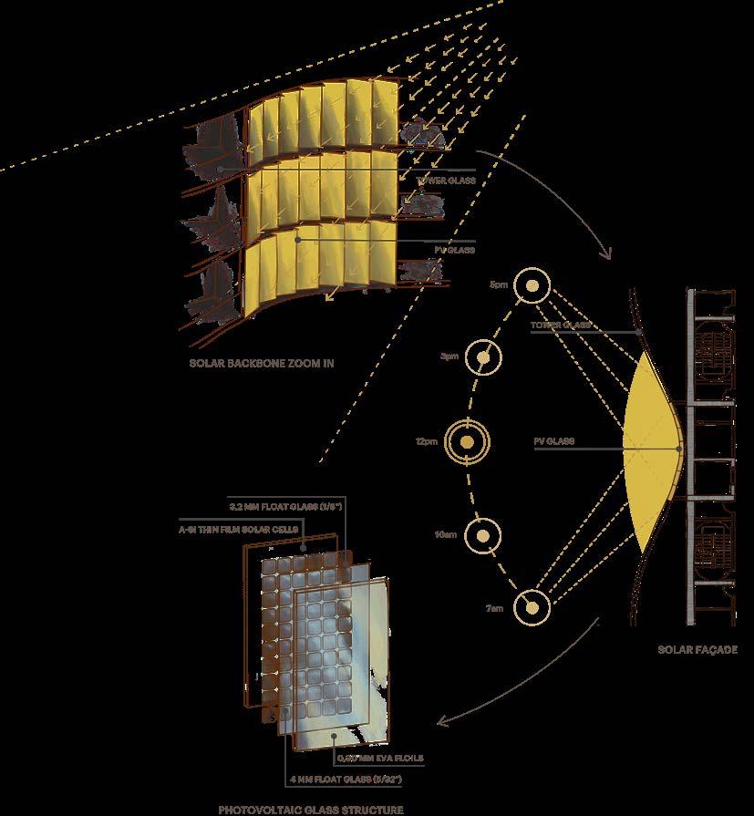 Features 500 photovoltaic-integrated windows along the west-facing façade.