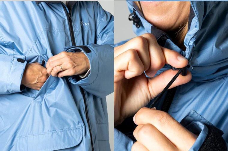 The Voited DryCoat 3.0 is a great solution for all of the above problems. Firstly, it’s water repellent and windproof on the outside, giving you instant protection on those windy days – the chief reason for ending up cold when clambering out of the sea and getting changed out of your swimwear. Secondly, the inside is lined with a microfibre fleece that is quick-dry and absorbent, giving you some much-needed warmth fresh out of the water that dries up nice and quick. Thirdly, it’s very roomy inside! Especially designed to facilitate getting changed, the sleeves are voluminous and the design allows plenty of wriggle room without ever needing to remove it so you can get changed out of your wet things and in to nice comfy dry clothes without worrying about exposure and staying warm at the same time. And just to top things off (literally!), there’s also an adjustable, insulated hood to help keep you head warm and out of the wind too.