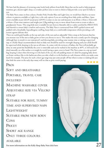 Lightweight Suitable from new born Cons Pricey Short age range Only three colours available For more information on the Kally Sleep Baby Nest click here
