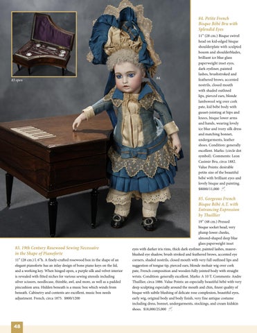 19” (48 cm.) Pressed bisque socket head, very plump lower cheeks, almond-shaped deep blue glass paperweight inset eyes with darker iris rims, thick dark eyeliner, painted lashes, mauveblushed eye shadow, brush stroked and feathered brows, accented eye corners, shaded nostrils, closed mouth with very full outlined lips and suggestion of tongue tip, pierced ears, blonde mohair wig over cork pate, French composition and wooden fully jointed body with straight wrists. Condition: generally excellent. Marks: A 10 T. Comments: Andre Thuillier, circa 1886. Value Points: an especially beautiful bébé with very deep sculpting especially around the mouth and chin, finest quality of bisque with subtle blushing of delicate rose complexion, beautiful eyes, early wig, original body and body finish, very fine antique costume including dress, bonnet, undergarments, stockings, and cream kidskin shoes. $18,000/25,000