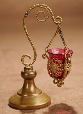7” (18 cm.) h. 10” diam. table. 6”h. lamp 4”w. Papeterie. The round mahogany table with center pedestal and tripod base with ball feet is designed for use as table (as shown), or with table top tilted upright when not in use, mid-1800s. Arranged on the table is a slant front Papeterie with gilt lettering (no contents), along with a gilded metal gas lamp with original milk glass shade, bone inkwell stand, bonehandled seal, bone-handled writing pen and three leather-bound miniature books. Excellent condition. Accessories are French, late 1800s. $1100/1500