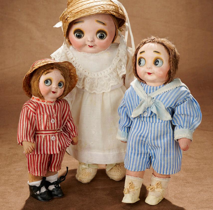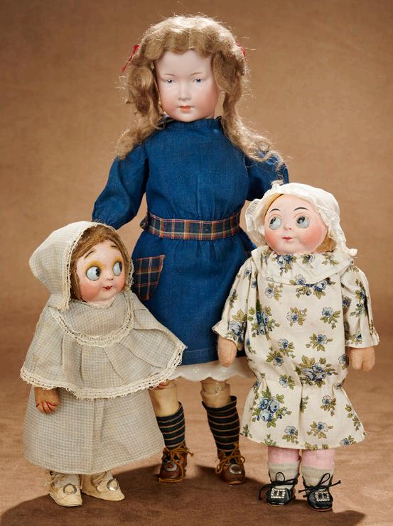 9” (23 cm.), 10 “ and 13”. Each is all-felt doll with attached very plump paper mache mask face, blue or brown glass large googly eyes glancing at each other, ochre eye shadow and brow shading, tiny button-shaped nose, tiny impish smile, one with brunette mohair hair and the other with fleecy curly wig, jointing at shoulders and hips. Condition: generally excellent. Comments: circa 1920, the dolls were made for the American market, trade name “Hug Me Kiddie”. Value Points: charming dolls, with appealing variations in eye color or glance. $600/900