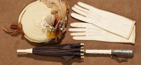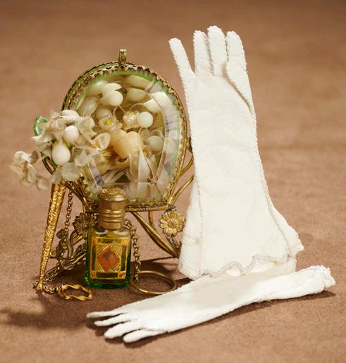 13” (33 cm.) l. parasol. Including woodenhandled parasol with ivory cover, lace edging, and brass hand grip with tassels, domed wooden trinket box with brass loop handle and clasp, three pairs of kidskin gloves, tussie-mussie, mother-of-pearl purse, fauxbone dresser jar with painted floral designs, and embossed brass dresser jar having hinged lid with interior mirror and pink silk-back powder puff. Excellent condition. French, circa 1880. $500/700