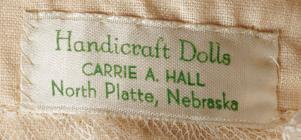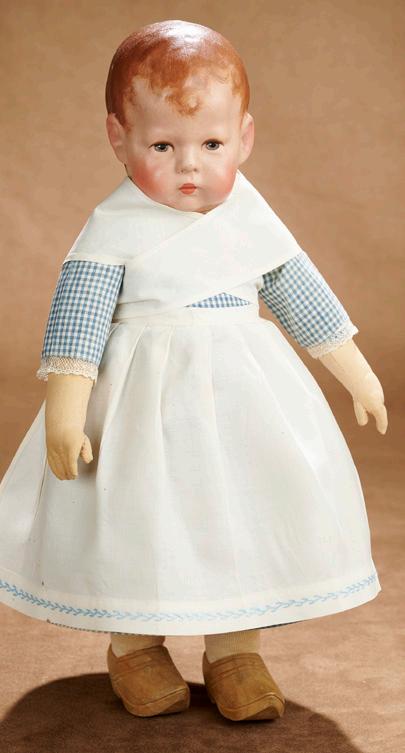 17” (43 cm.) Felt swivel head with pressed and painted facial features, blue side-glancing eyes, grey eye shadow, painted lashes, single stroke brows, closed mouth, blonde mohair wig, jointing at shoulders and hips. Condition: generally excellent, some costume