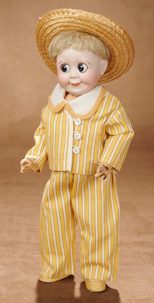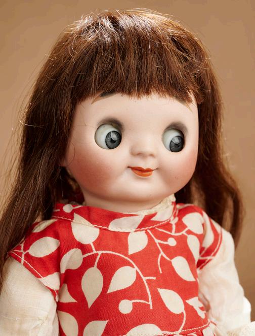 12” (30 cm.) Bisque socket head, blue glass sleep and side-glancing googly eyes, painted lashes, lightlyfeathered brows, accented nostrils, closed mouth with center accent line, brunette mohair bobbed wig, composition toddler body jointed at shoulders and hips, antique costume. Condition: generally excellent. Marks: Germany 323 A 0 M. Comments: Marseille, circa 1920. Value Points: rare large size of the beloved model with wonderful expression and bisque, original body and wig. $400/500
