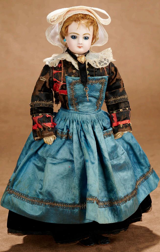 14” (36 cm.) Bisque swivel head on kid-edged bisque shoulderplate, brilliant blue glass paperweight inset eyes, painted lashes, brushstroked brows, accented nostrils and eye corners, closed mouth with center accent line, auburn mohair wig over cork pate, French kid/muslin poupée body. Condition: generally excellent. Comments: French, circa 1880, attributed to Jumeau. Value Points: all-original, the poupée is wearing original traditional regional costume including jewelry and coiffe. $1600/1900