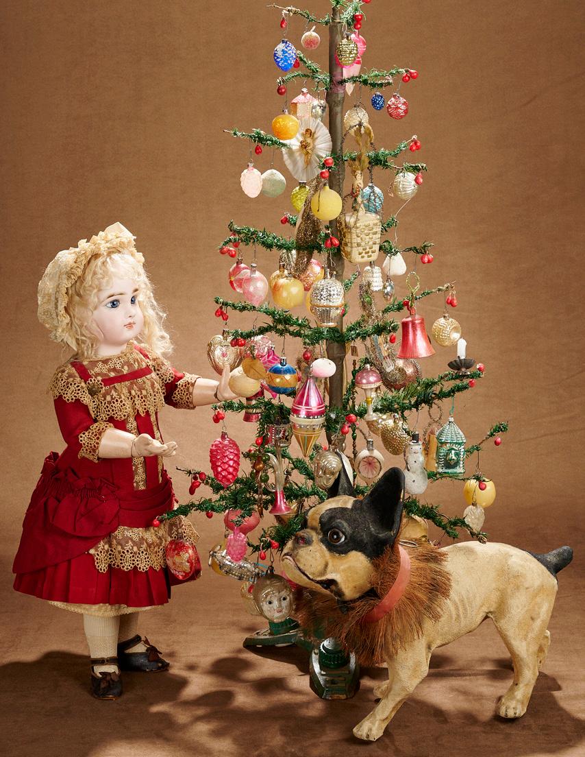 32” (81 cm.) Arranged upon a vintage-style feather tree are about 45 vintage ornaments including blown glass, cotton wrapped fruits and vegetables, wire-wrapped finial and with assorted garlands including one with acorn beads. Very good/ excellent. Ornaments are early/mid 1900s. $500/700