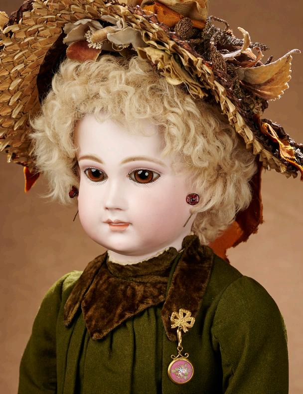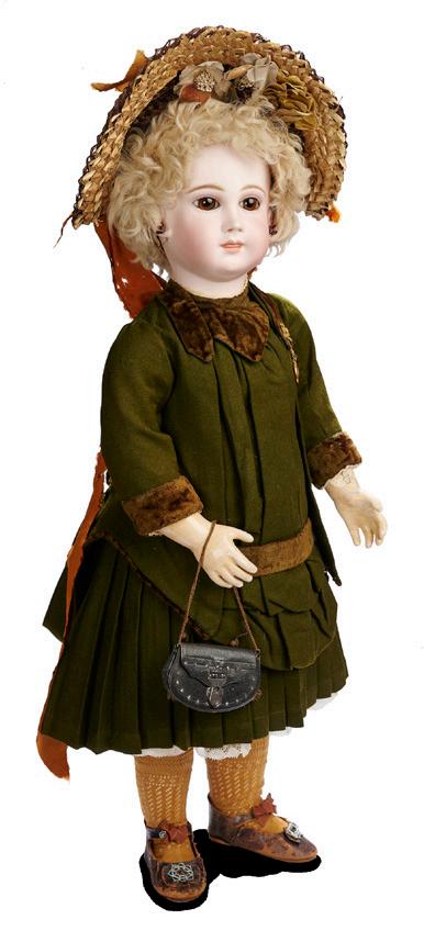 27” (69 cm.) Bisque socket head with pear-shaped modeling, amber brown glass inset eyes with spiral threading and darker outer iris rims, dark eyeliner, brushstroked and feathered brows, rose-blushed eye shadow, accented eye corners, shaded nostrils, closed mouth, defined space between the shaded and outlined lips, pierced ears, blonde mohair hair wig over original pate, composition and wooden eight-loose-ball-jointed body with straight wrists and flat-cut derriere. Condition: generally excellent. Marks: Sch (in shield, on head and derriere base) 13 (head). Comments: Schmitt et Fils, circa 1882. Value Points: especially beautiful face with finest bisque, complexion and painting, compelling size, antique costume comprising green woolen dress with velvet cuffs, collar and sash, undergarments, stockings, shoes, elaborate bonnet, green leather purse, and watch with fob. $6000/8000