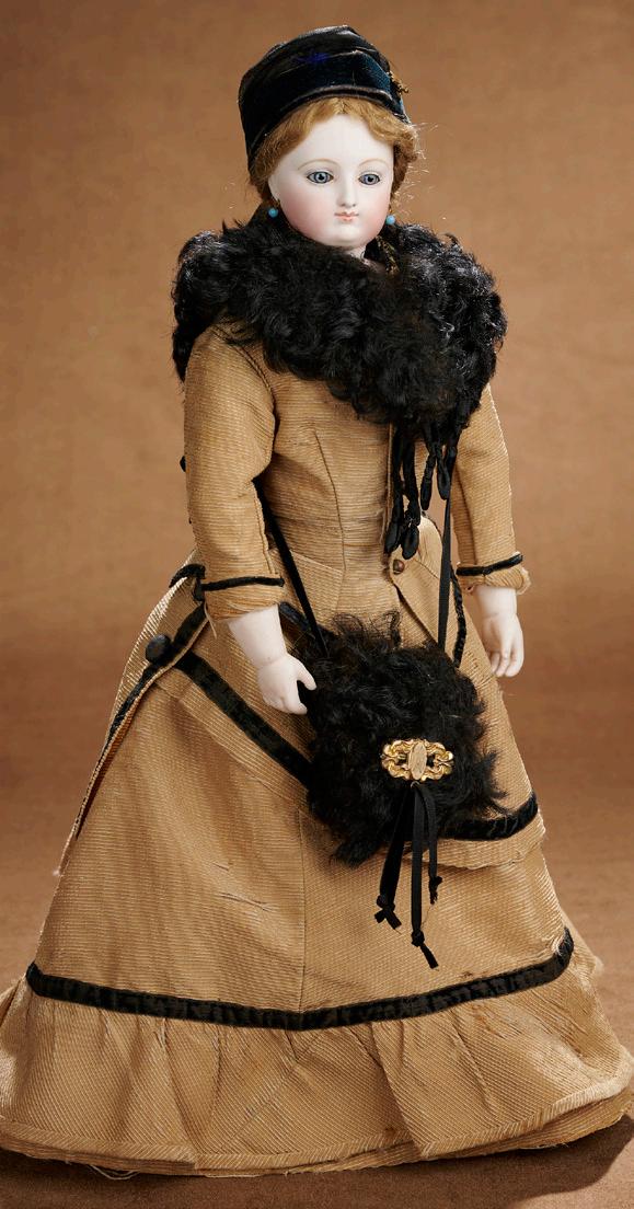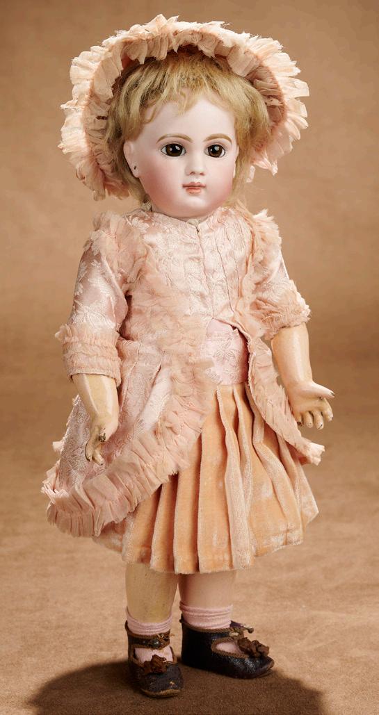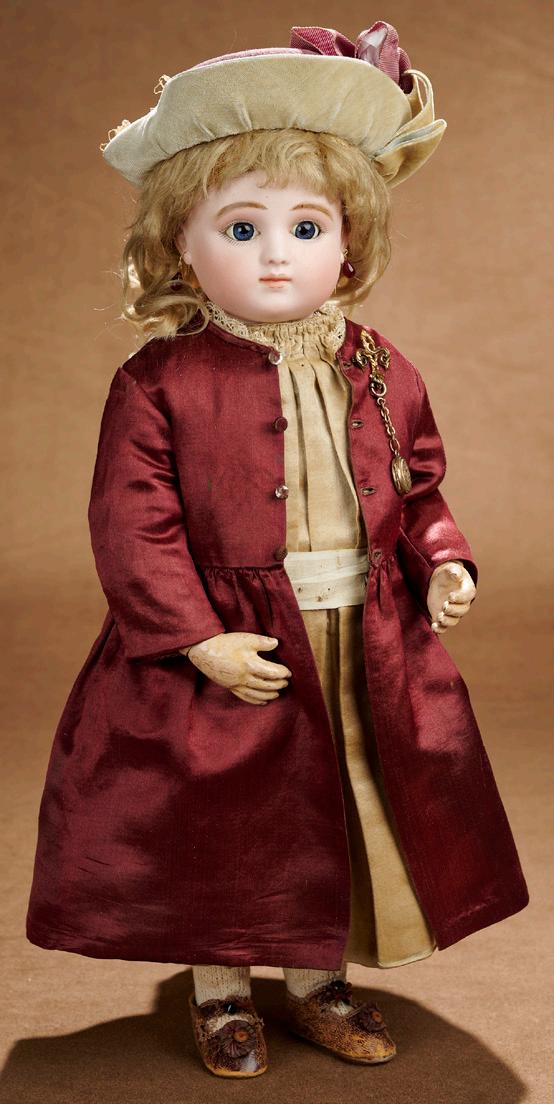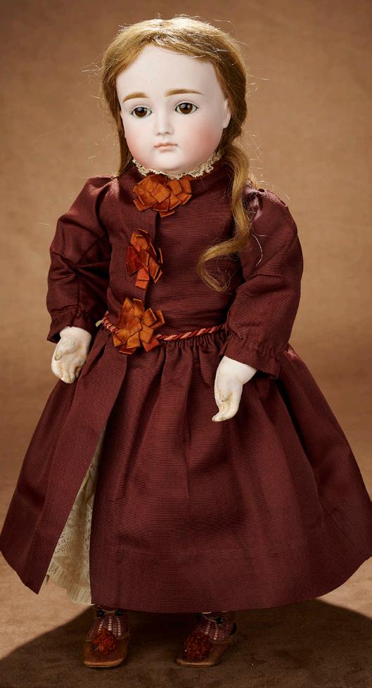 17” (43 cm.) Bisque swivel head on kid-edged bisque shoulderplate, blue glass enamel inset eyes, painted lashes, feathered brows, accented nostrils and eye corners, closed mouth with accented lips and modeled smiling expression, pierced ears, auburn mohair wig over cork pate, all-wooden lady body with dowel-articulation at shoulders, elbows, wrists, hips, knees and ankles, ball-jointed waist. Condition: generally excellent. Marks: F. Comments: Leon Casimir Bru, circa 1872, both the distinctive facial model and the wooden body were deposed by that firm in 1867 and 1872. Value Points: the rare deluxe model of his deposed poupée has full-articulation of all limbs, fine original body finish, lovely expression with fully achieved smile, beautiful antique costume. $3500/4500
