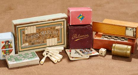 ½” (6 cm.) -4”. A variety of miniature board games and accessories includes dominoes chest game with additional game boards, construction set in original Au Bon Marche box, several games of cards, dice in brass jar, and set of bone bowling pins. Excellent condition. French, late 1800s. $500/600