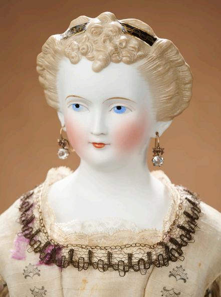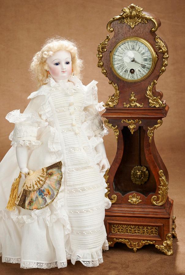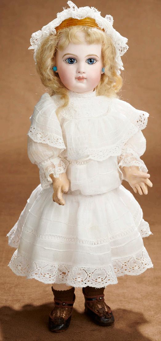 17” (43 cm.) Pale bisque swivel head on kid-edged bisque shoulderplate, cobalt blue glass inset eyes, dark eyeliner, painted lashes, soft rose blushed eye shadow, feathered arched brows, accented nostrils, closed mouth with accent line between the lips, unpierced ears, pale blonde mohair wig over cork pate, stretched-kid over wooden poupée body with shapely torso, doweljointing at shoulders, elbows, hips and knees, bisque lower arms and hands with cupped fingers, kid lower legs. Condition: generally excellent. Comments: French, circa 1867. Value Points: exceptional beauty enhanced by the decorative element around the eyes, rare body style, perfect hands, lovely vintage costume of ivory brocade and lace, wax orange blossoms in hair. $2800/3400