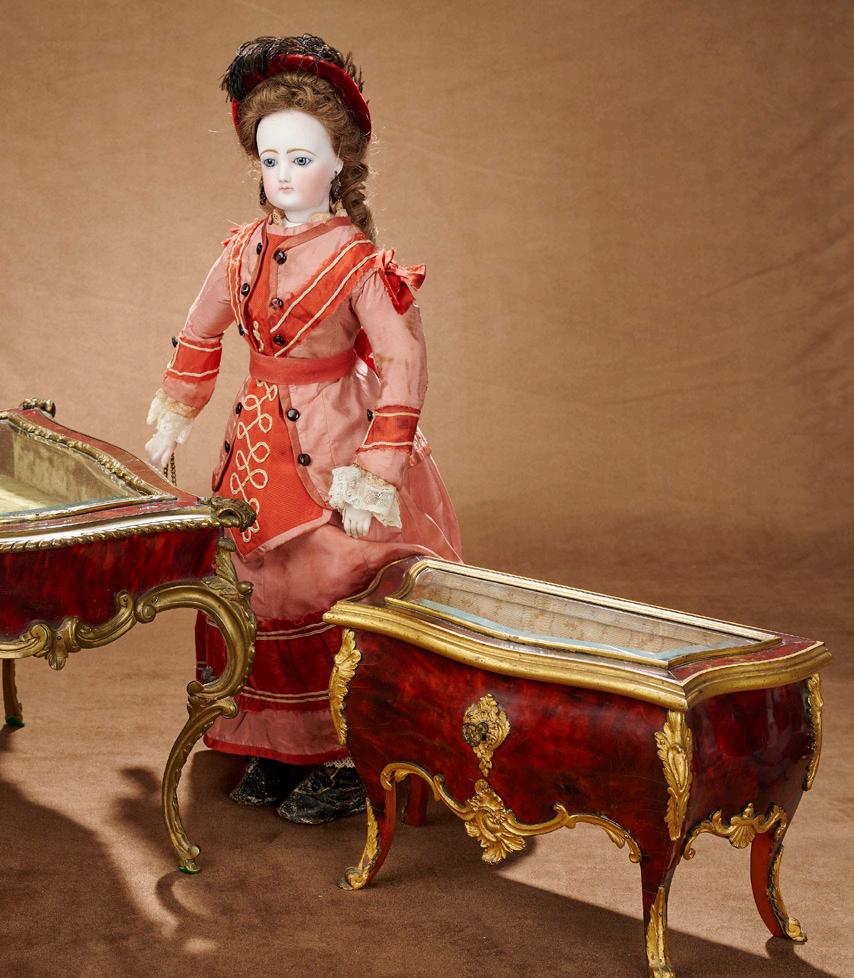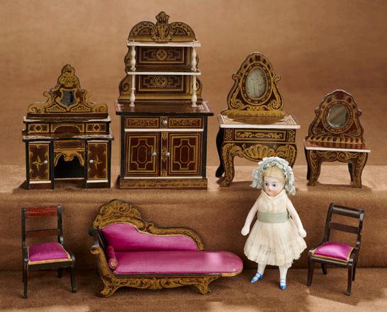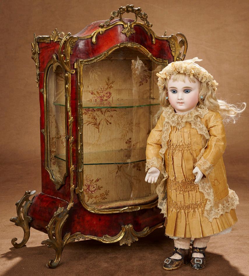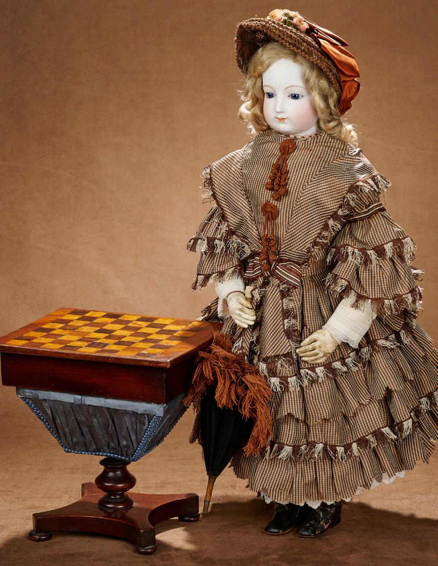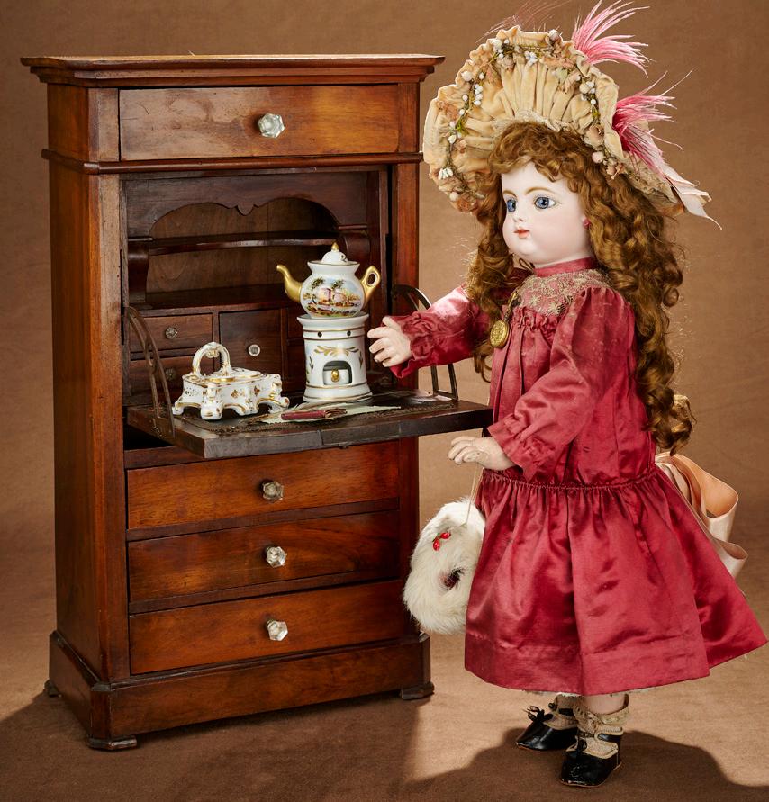 The nearly forgotten and charming word “Nonesuch”, meaning unparalleled, a paragon, a thing without equal, seems a perfect one-word description of the rare and historically important antique dolls which are presented at Theriault’s late Autumn Marquis auction of antique dolls and playthings. The auction features the private collection of Laurie Baker of Colorado, offering the French poupées, fashion accessories, and maitrise furniture which she explored in her many well-researched articles written for Antique Doll Collector, a truly exemplary collection. Too, there are nonesuch dolls from the private collection of noted connoisseur Sandra Ottiger ranging from an extraordinary English wooden with original costume to fine early paper maches, some from notable previous collections to porcelain dolls by KPM and further very fine French poupées. A delightful contrast is also offered by the collection of John Oxley of Michigan whose fascination with googly dolls led him to assemble a grand assortment of these wide-eyed wonders, and in the private dollhouse collection with remarkable miniature furnishings highlighted by an important dollhouse, originally featured in the Washington Doll House Museum of Flora Gill Jacobs.