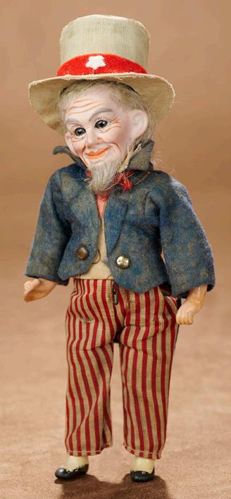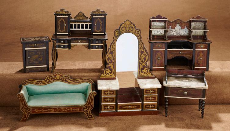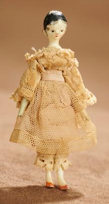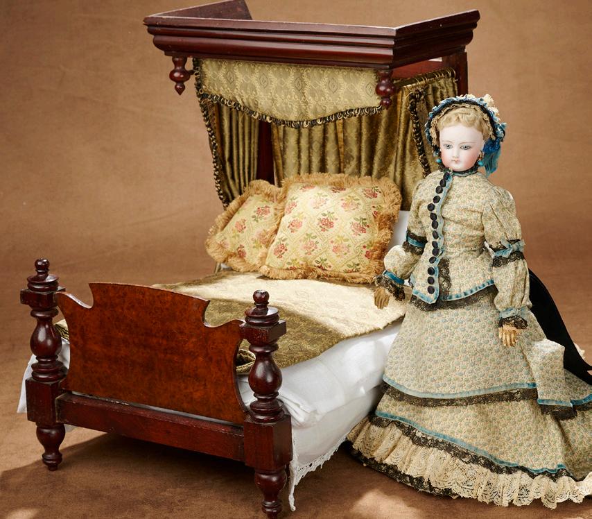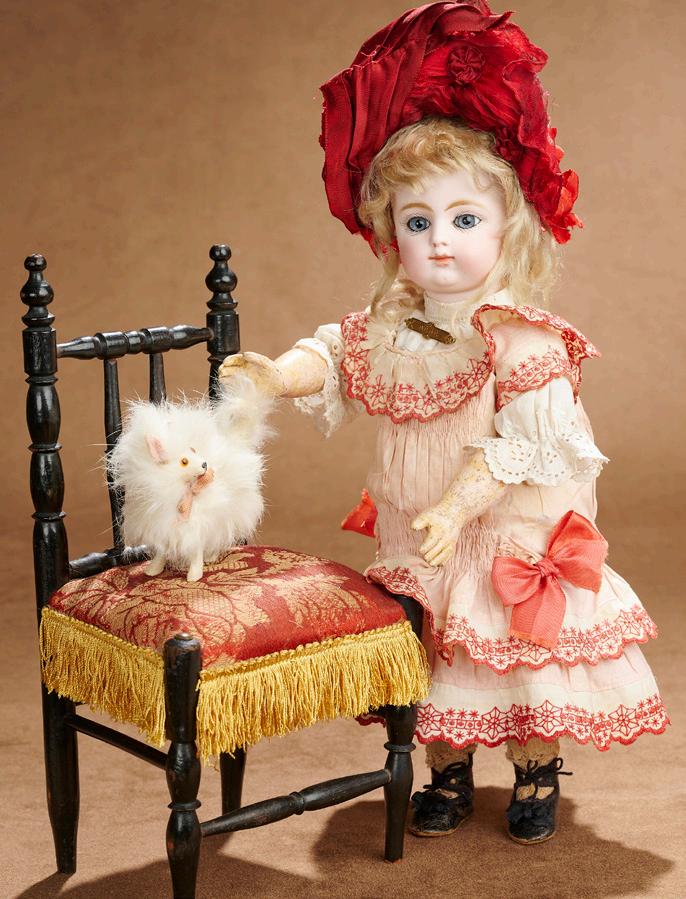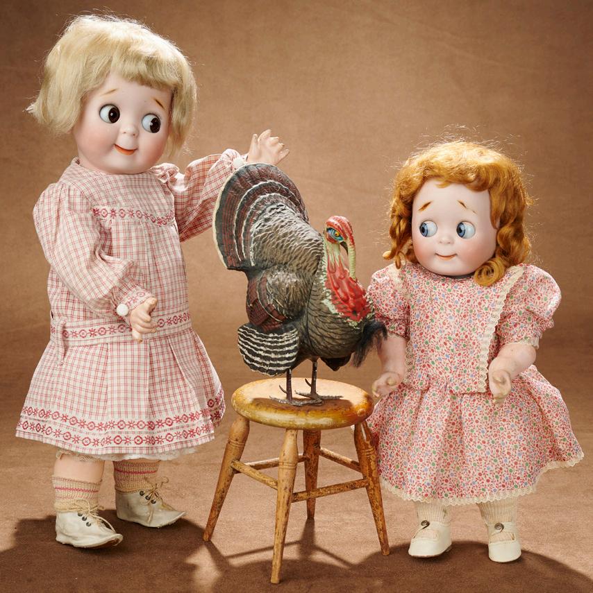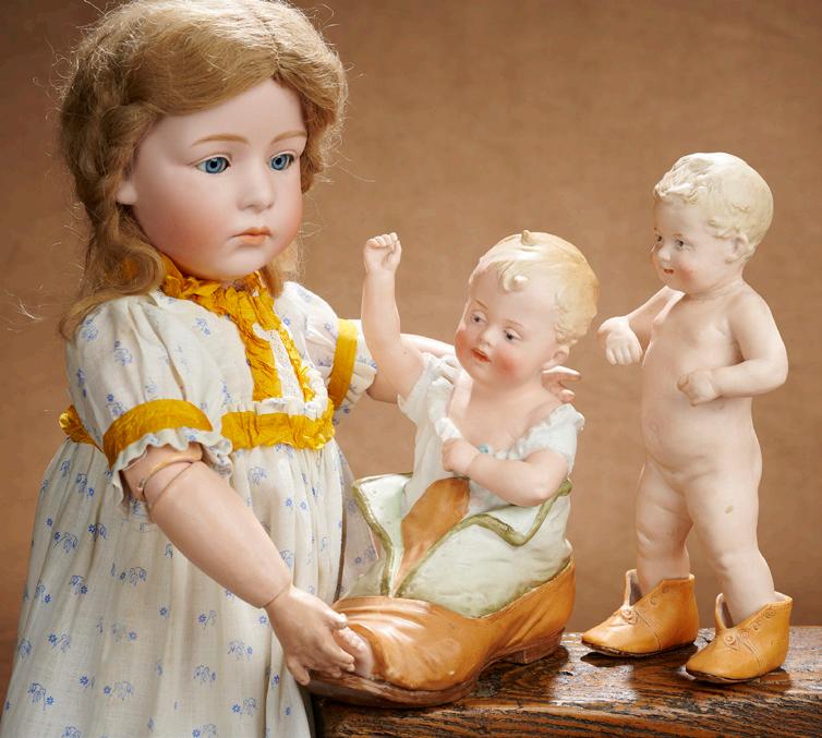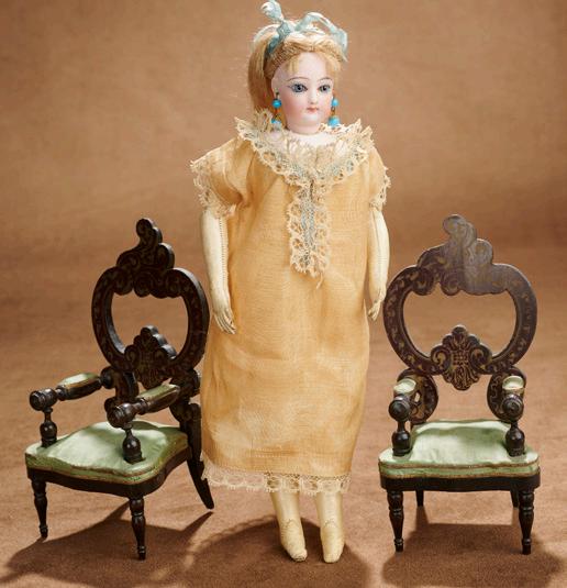 The nearly forgotten and charming word “Nonesuch”, meaning unparalleled, a paragon, a thing without equal, seems a perfect one-word description of the rare and historically important antique dolls which are presented at Theriault’s late Autumn Marquis auction of antique dolls and playthings. The auction features the private collection of Laurie Baker of Colorado, offering the French poupées, fashion accessories, and maitrise furniture which she explored in her many well-researched articles written for Antique Doll Collector, a truly exemplary collection. Too, there are nonesuch dolls from the private collection of noted connoisseur Sandra Ottiger ranging from an extraordinary English wooden with original costume to fine early paper maches, some from notable previous collections to porcelain dolls by KPM and further very fine French poupées. A delightful contrast is also offered by the collection of John Oxley of Michigan whose fascination with googly dolls led him to assemble a grand assortment of these wide-eyed wonders, and in the private dollhouse collection with remarkable miniature furnishings highlighted by an important dollhouse, originally featured in the Washington Doll House Museum of Flora Gill Jacobs.