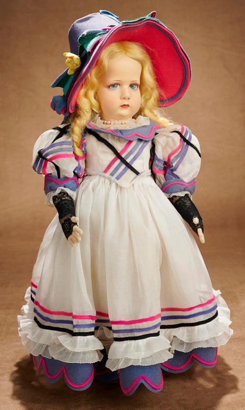 19” (48 cm.) Felt swivel head with pressed and painted facial features, blue sideglancing eyes, grey eyeshadow, brown painted curly upper lashes and brows, accented nostrils, closed mouth, blonde mohair wig with soft curls, jointing at shoulders and hips. Condition: generally excellent. Comments: Italian, Lenci, from her series 110, circa 1927. Value Points: pristine condition, wearing original white organdy gown with puff sleeves, felt appliques and ruffles in grey, magenta and black, matching wide-brimmed bonnet, black lace fingerless gloves, organdy undergarments, blue felt shoes. $700/900