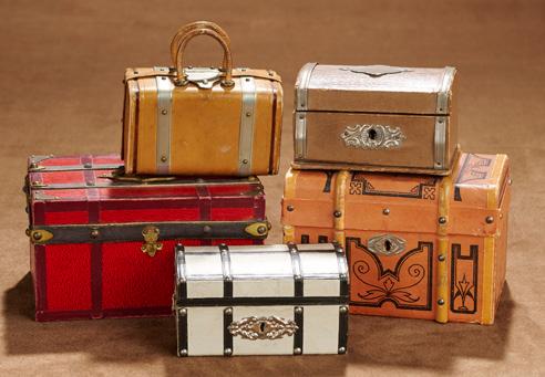 3 ½” (9 cm.) -6” Each is firm-sided with lithographed paper, linen, or canvas cover, and with wooden or metal straps, various handles and trim; the two larger open to lift-out tray, the two domed-top trunks have tufted silk interiors, and the brown suitcase opens to a well-fitted necessaire with sewing tools, scissors, needle case, awl, thimble, and more. Excellent condition. Early 1900s. $400/500