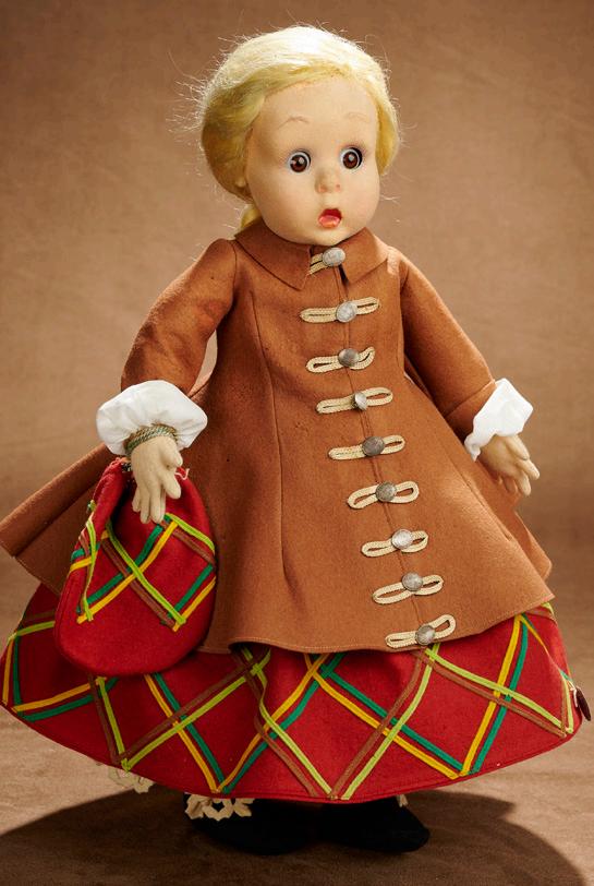 20” (51 cm.) Felt swivel head with pressed facial features, brown glass side-glancing large googly eyes, painted upper lashes, V-shaped brows, rounded pug nose, “O”- shaped mouth, blonde mohair wig, jointing at shoulders and hips. Condition: very good, some fading of jacket, hat missing. Comments: Lenci, circa 1939. Value Points: the look of amazement is well-achieved, the sought-after Lenci model wears original Scottish Girl costume including felt applique bag which matches her skirt and which is rarely found. $500/800