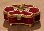 12” (30 cm.) h. 9”w. x 6”d. Of very fine burled walnut veneer in unusual paneled design, the cabinet features three drawers, each with elaborate ormolu handles and fleur-de-lis framed key holes (key included), below a slant-back top which hinges open to reveal a white marble top and mirror, for use as dressing table. The cabinet is accented with ebony wooden edges all around. Included is a pair of white porcelain vases with gilt accents and wax orange blossom bouquets. Excellent condition. French, circa 1875, the superb craftsmanship and luxury details suggest its probable origin from the luxury Parisian store Maison Giroux. $1200/1500