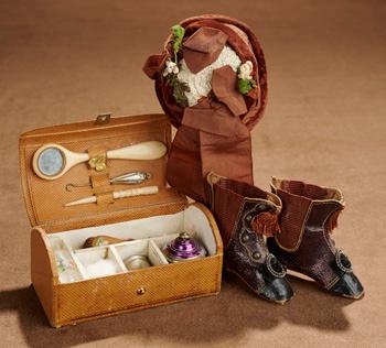 The group includes 5”w. domed leather necessaire as traveling case which opens to reveal fitted interior containing an assortment of accessories including unusual hand mirror, folding fan, jars, and powder puff, along with pair of brown leather ankle boots with elastic ankle inserts, heels, tassels and incised 6. R. P., and a white woven bonnet (2” inside head width) lavishly decorated brown silk