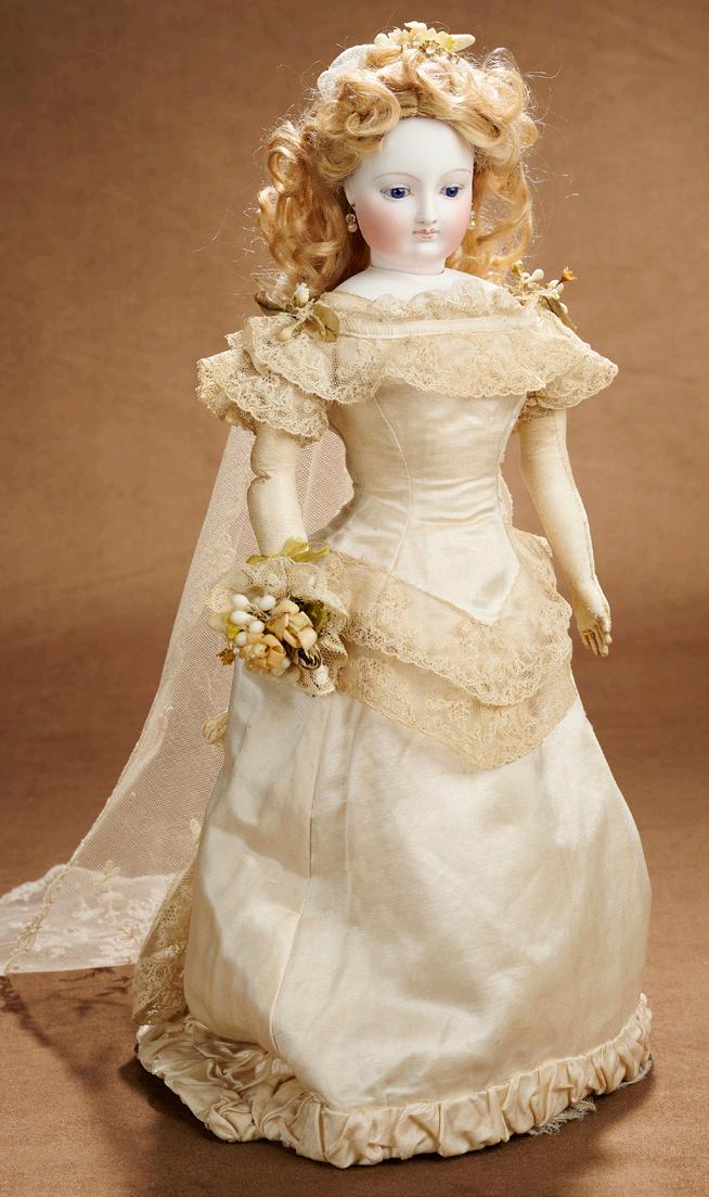 18” (46 cm.) Bisque swivel head on kid-edged bisque shoulderplate, small cobalt blue glass inset eyes, dark eyeliner, painted lashes, lightlyfeathered brows, accented nostrils and eye corners, closed mouth with accented lips, ears pierced into head, blonde mohair wig over cork pate, French kid poupée body with gusset-jointing at elbows, hips and knees. Condition: generally excellent. Marks: Brevete SGDG (stamp on torso). Comments: French, circa 1865, the doll was shown and in an article in Antique Doll Collector, May 2012 by Laurie Baker. Value Points: very fine pale complexion contrast the cobalt blue eyes, sturdy original body, wearing antique ivory satin wedding gown with lace and wax orange blossom trim, orange blossom bouquet and coronet with floor length veil. $2800/3400