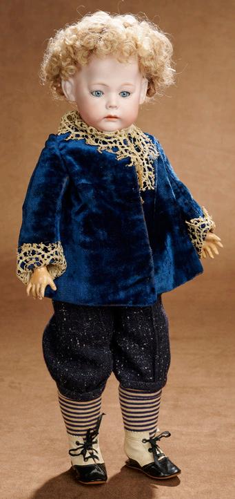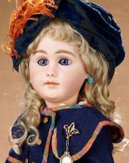 24” (61 cm.) Bisque socket head, blue glass paperweight inset eyes, dark eyeliner, painted lashes, mauve blushed eye shadow, brushstroked brows, accented nostrils, closed mouth with shaded lips, pierced ears, blonde mohair wig over cork pate, French