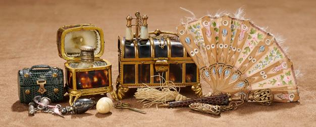 8” (20 cm.) l. parasol. Included is bone-handled parasol with scalloped-rim brown silk parasol; brown kidskin purse with soft metal trim and original leather attached belt; carton suitcase with leather trim; marbled paper carton hat box; tortoise shell mandolin with mother-of-pearl inlay, tan kidskin gloves with buttons at wrist, and miniature leather bound book “Dante, La Divinia Commedia”. Excellent condition. French, circa 1875. $500/700