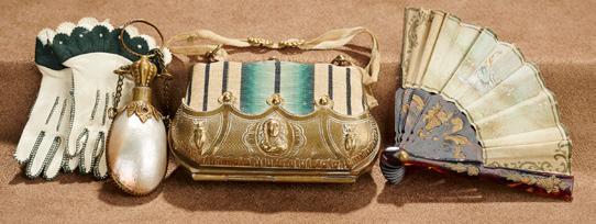8” (20 cm.) Including 8” bonehandled parasol with purple silk cover and ivory silk fringe trim; gilt medal purple with chain handle and rosette floral medallions forming the side walls; purple kidskin gloves; and a folding fan with ivory and bone blades and belt loop and chain. Excellent condition. French, circa 1875. $600/800