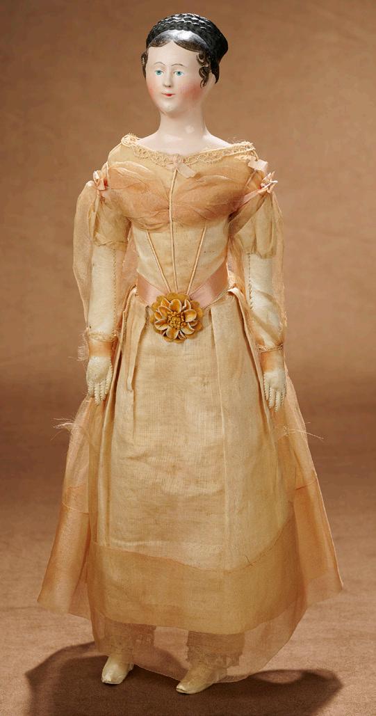dowel-jointing at hips and knees, shapely lower legs. Condition: generally excellent. Comments: English, mid-1700s, an elegant size and fine state of preservation suggest aristocratic origin; the maker remains unknown. Value Points: fine commanding presence with gentle expression, wearing original costume of fine English ivory twill silk with hand-painted flowers and vine and with matching cape with intricately embroidered edging. $22,000/28,000