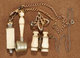 2” (5 cm.) necessaire. Fine collection includes bombe-shaped handled necessaire fitted with tiny bone sewing tools; 1 ½” firm-sided hinged sewing necessaire with red leather cover fitted with very tiny bone sewing tools and gilt scissors; rare gold-plated bracelet with coral stone; bone darning egg with handle; leather purse, bow-shaped pin with enamel faux watch; gilt metal skirt lifter; handkerchief, and desk seal with tourmaline handle. Excellent condition. French, circa 1875. $700/900