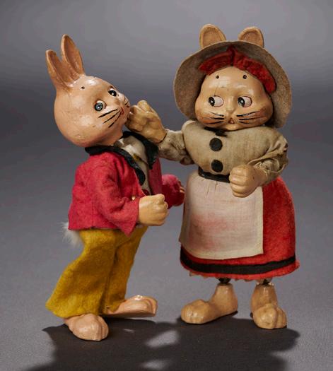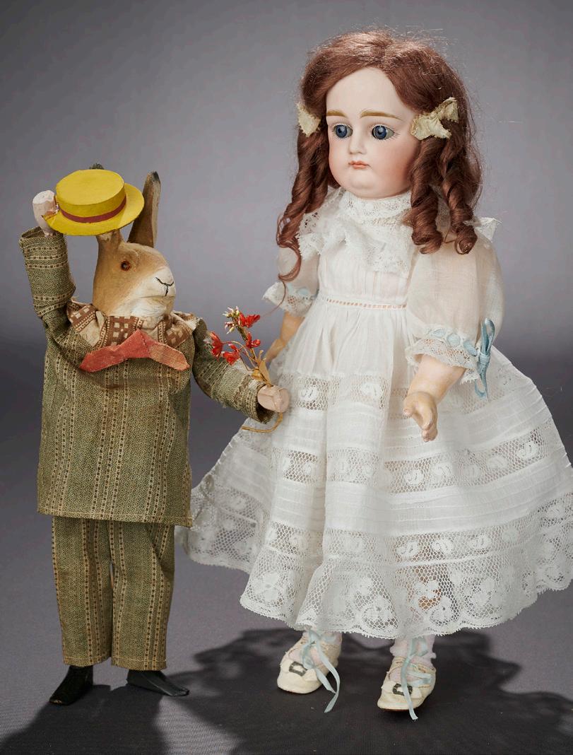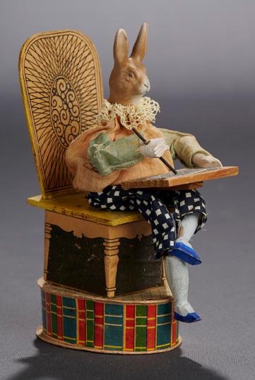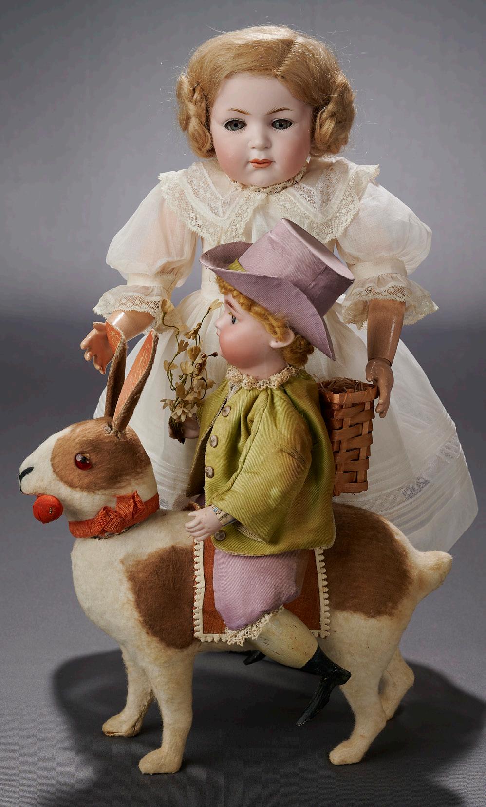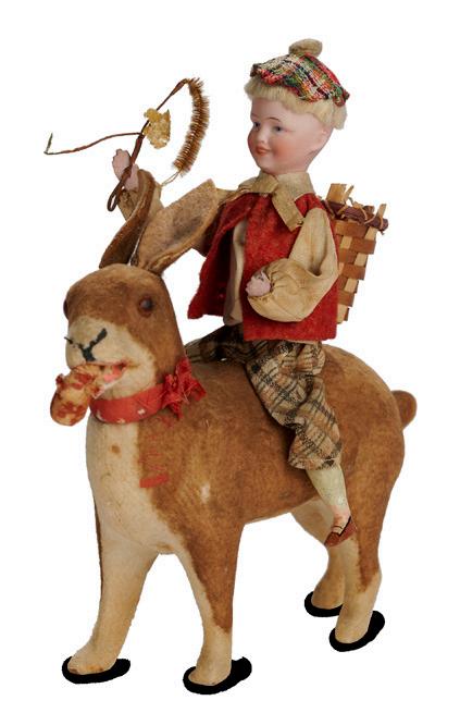 7” (18 cm.) Seated upon a paper mache bunny with white fluffy coat and metal wheeled base is a bisque head boy with blue glass eyes, wooden block torso, composition hands and feet, antique costume, wicker basket at his back; the bunny has tail which moves up and down, designed to cause the ears to move up and down. Condition: generally excellent, tail mechanism needs repair. Comments: Germany, circa 1900. Value Points: the springtime candy container boy is delightfully designed. $700/900
