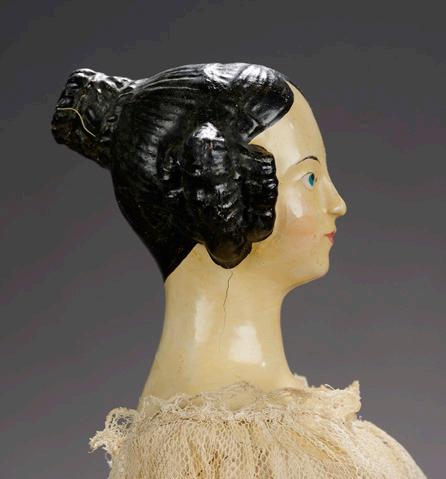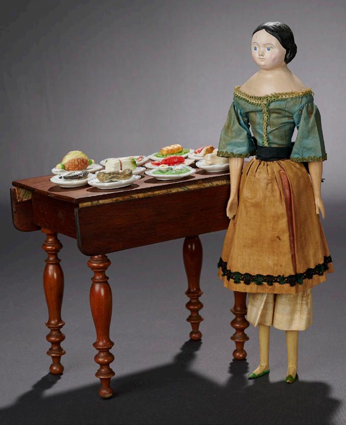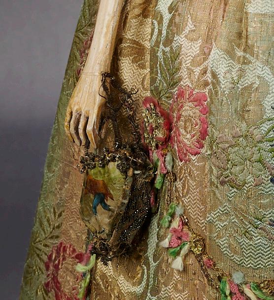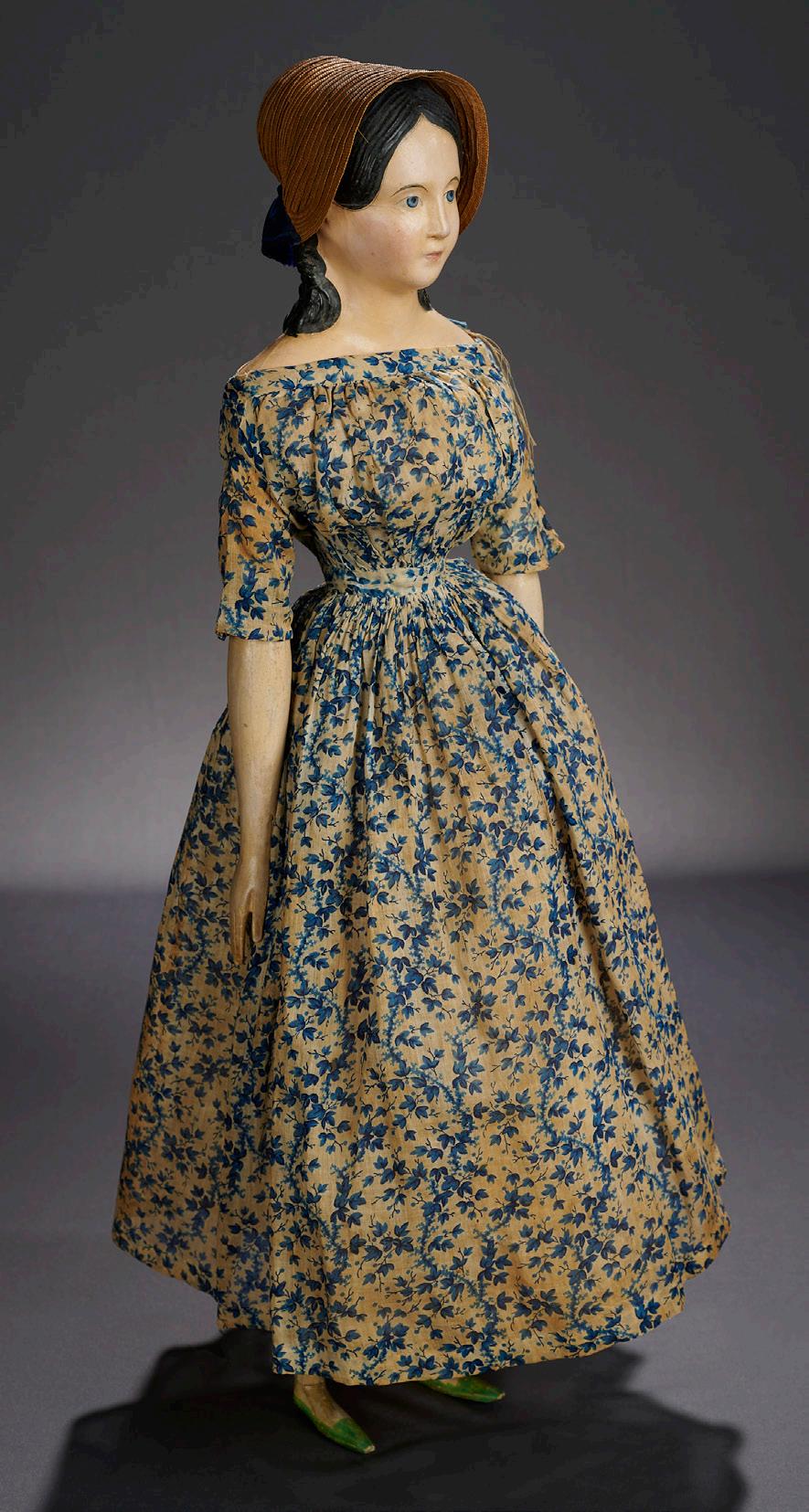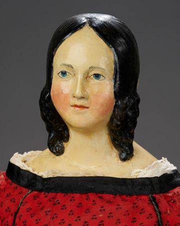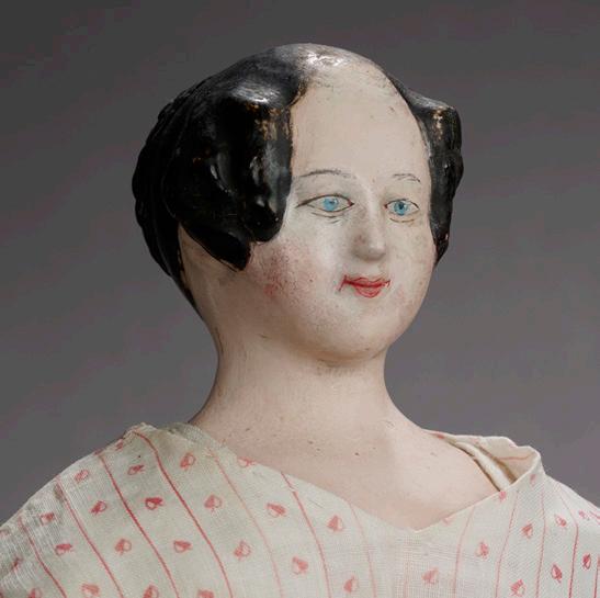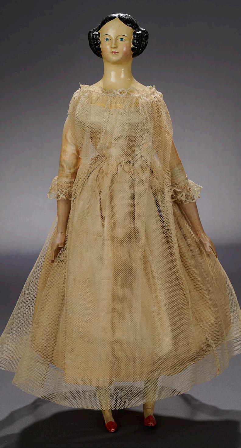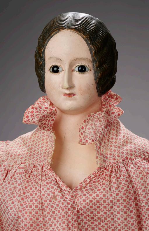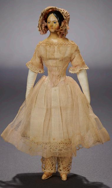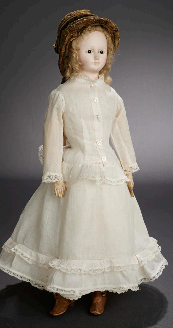 26” (66 cm.) One piece wooden head and torso with unusual shaping of face, generously modeled high bosom, high domed forehead, pronounced dark enamel inset eyes with carved definition of eye sockets, painted lashes, dot-outlined brows, tiny closed mouth, typical cheek blush spots, light brown wig with arranged coiffure, sculpted ears, cloth upper arms, wooden lower arms with spatula shaped hands, dowel and pin-jointed hips and knees. Condition: generally excellent, very fine minor professional retouch. Comments: English, mid-1700s, it is oral tradition, but not documented, that the doll was originally the property of the aristocratic Childs family of the Wanstead House of Essex. The doll’s splendid size and distinctive portraiture bearing certainly verifies a lofty origin, and as it was acquired by its present owner many years ago from a private unnamed resident of that immediate area, the legend seems likely. Value Points: the carving of the facial features is magnificent, from the dramatic presentation of the eyes to the strong throat which is softened by the dainty tiny chin point. The doll is wearing superb early costume, likely original to the doll, of Lampas silk with enhanced garlands of flowers, crewel embroidered petticoat, woven stockings, green silk slippers with floral trim, padded velvet bi-corn hat with gilt metallic trim, tiny beaded necklace with prismatic medallion and carries a stiffened Lampas silk reticule. $60,000/85,000