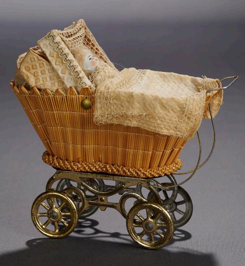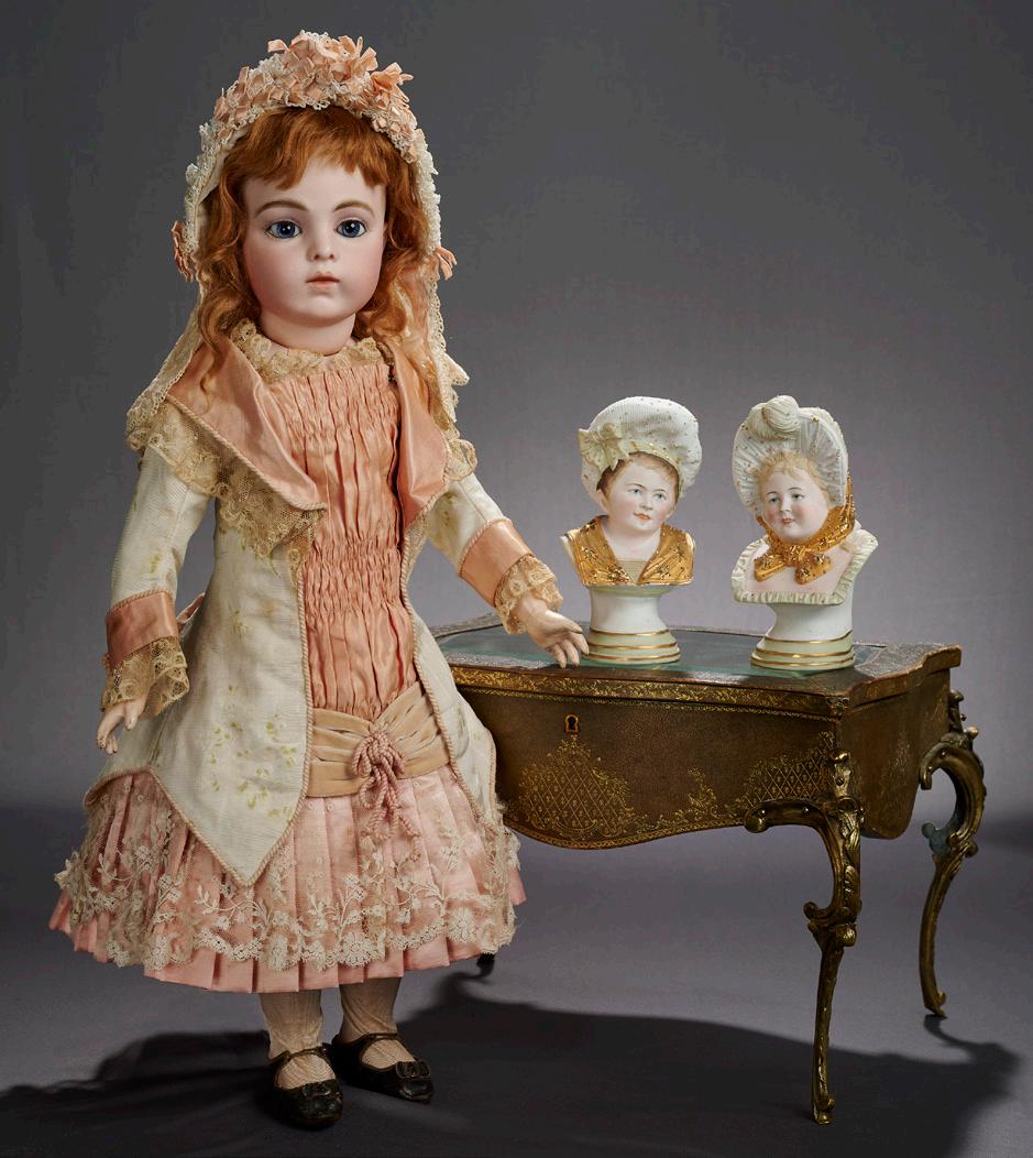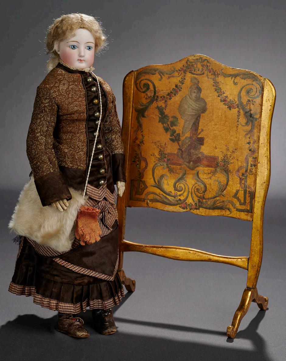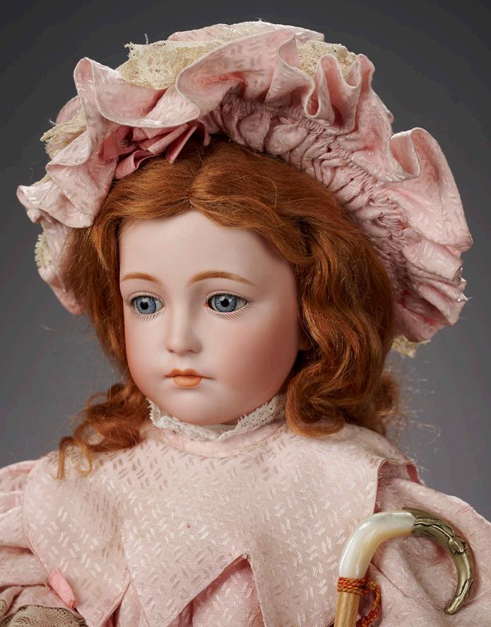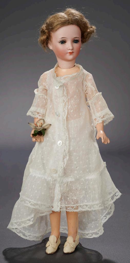 20” (51 cm.) Bisque socket head with fine characterization of cheek bones and chin, almond-shaped blue glass sleep eyes, dark eyeliner, painted curly lashes, widely-arched brushstroked brows, accented nostrils and eye corners, closed mouth with center accent line, auburn mohair wig, composition and wooden ball-jointed body. Condition: generally excellent. Marks: 111 7. Comments: Simon and Halbig, possibly for Kammer and Reinhardt’s art character series, this being the glass-eyed version of the 111 character which was registered in 1910; just as with the 112 and 114 models it was likely created with either painted eye or this sleep-eyed version. Value Points: the extremely rare model has finest quality of bisque and painting, original body and body finish, compelling wistful expression, and outstanding original rose silk costume comprising dress with matching bonnet and reticule, undergarments, socks, shoes, and rose silk parasol. $15,000/19,000