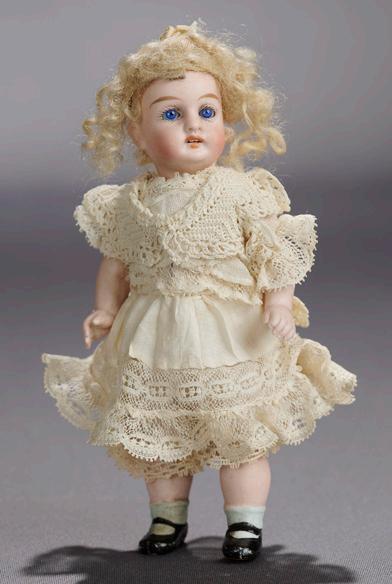 5” (13 cm.) Bisque swivel head on bisque torso, cobalt blue glass eyes, painted lashes and brows, tiny accented nostrils, closed mouth, blushed cheeks, blonde mohair wig, peg-jointed bisque arms and legs, painted white stockings and brown two-strap heels. Condition: generally excellent. Comments: French, circa 1882. Value Points: especially