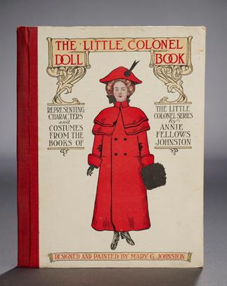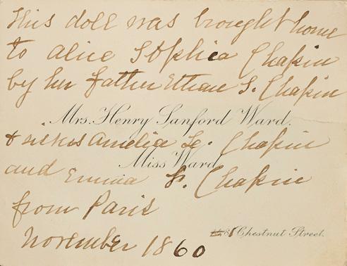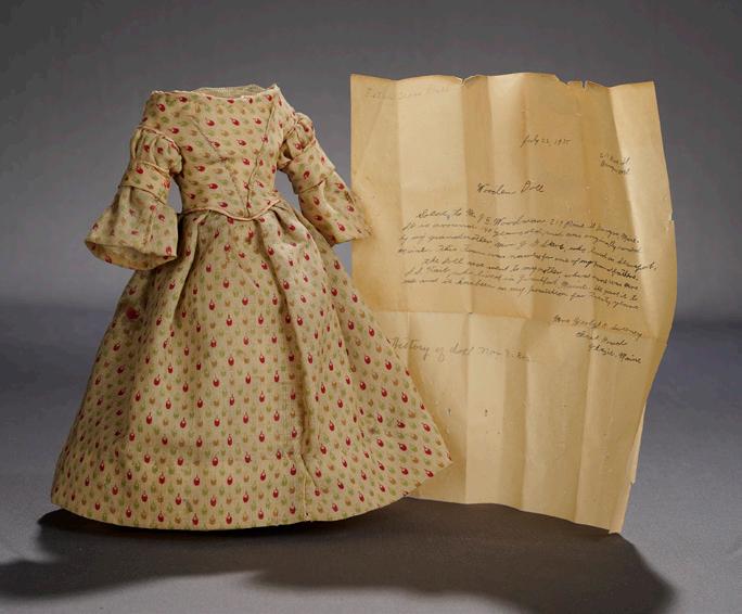 21” (53 cm.) x 30” frame. 7”-8” costumes. Twelve costumes and one doll are presented in the framed arrangement under glass; some costumes illustrated and painted by the artist and others are hand-painted from printed images. Each costume is accompanied by a finelylettered note indicating the name of the costume and its year of appearance such as “worn at the Fancy Ball at Carlton House July 15 1819” and “Court Dress 1822”. Excellent condition. English, early 1800s. $500/700