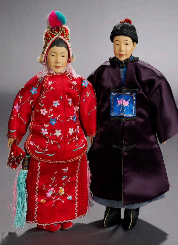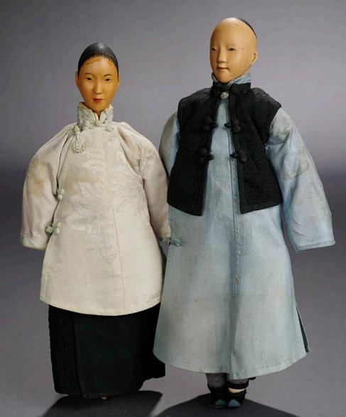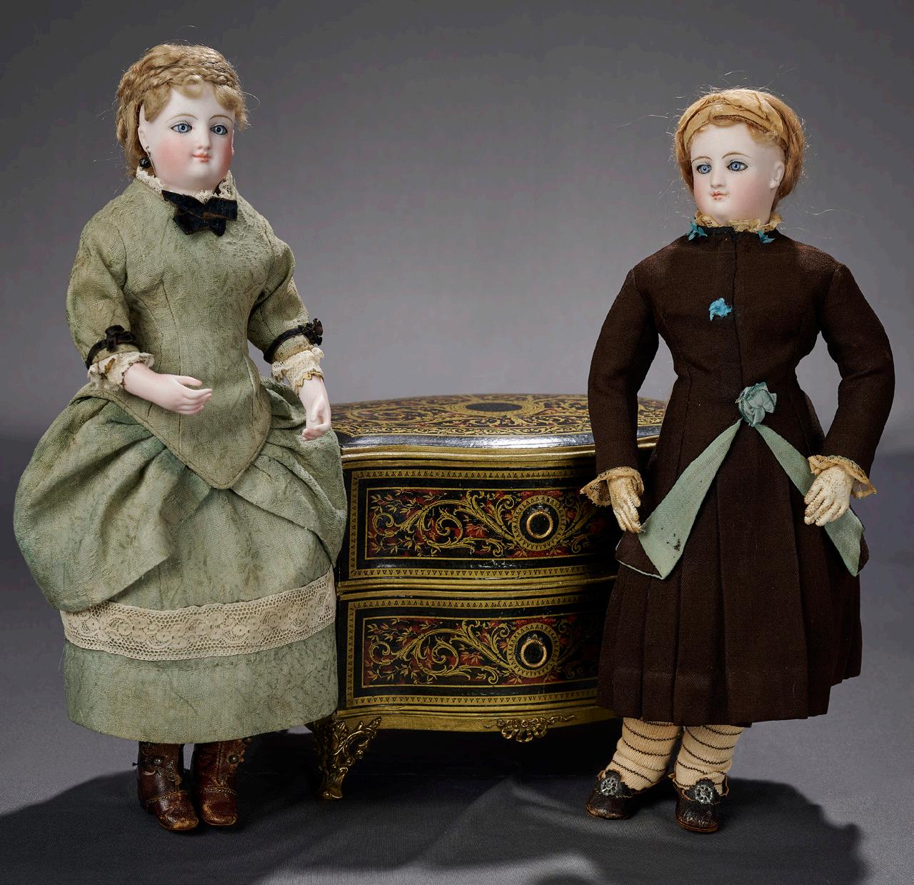 Value Points: very fine luminous bisque with gleaming patina, beautiful painting around the eyes enhances their deep spiral threading, lovely antique costume. $2800/3600