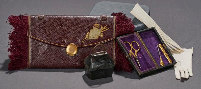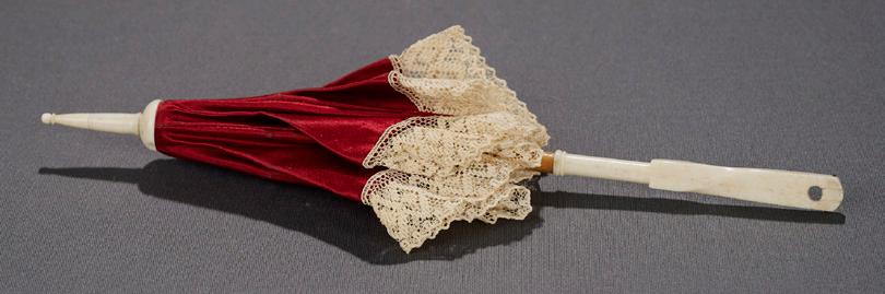 7” (18 cm.) purple parasol. Included is parasol with bone handle and purple silk cover; parasol with bone handle and (frail) green silk cover; set of bone miniature dominoes in original decorated box, leather purse with silver studs and original attached leather belt, cream kidskin gloves, white fur muff in original green cylinder box, gilt metal jewel box with tiny rhinestone doll ring, bone opera glasses with Paris scenes, and an assortment of doll jewelry including beads, rosary, watch and fob. Excellent condition. French, circa 1875. $1100/1300