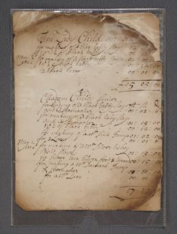 side and hooks at the other, heavily boned with baleen whale bones, and of densely-patterned woven silk. And fitted cap whose silk is covered with thickly embroidered metallic gilt, trimmed with a border of lace and having gilt tassels at the crown, with stiff buckram lining. The stays and bonnet are preserved in an early box along with an early handwritten invoice from 1704 detailing fabrics and trims purchased for Lady Child of Wanstead House of Essex, and which include materials likely used in the construction of these two articles. English, early 1700s. $2500/3500