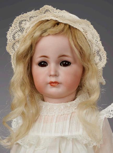 16” (41 cm.) Bisque socket head, blue glass sleep eyes, painted lashes, short feathered brows, accented nostrils and eye corners, open mouth, outlined lips, two porcelain upper teeth, impressed cheek dimples, blonde mohair wig over plaster pate,