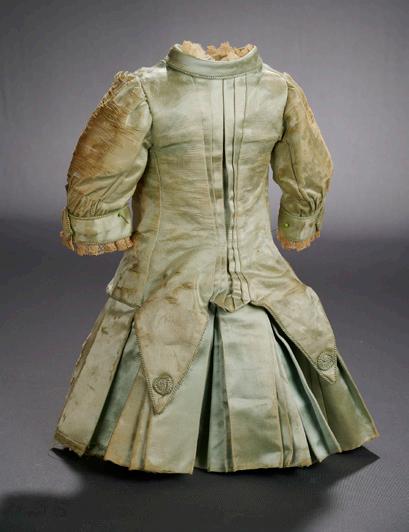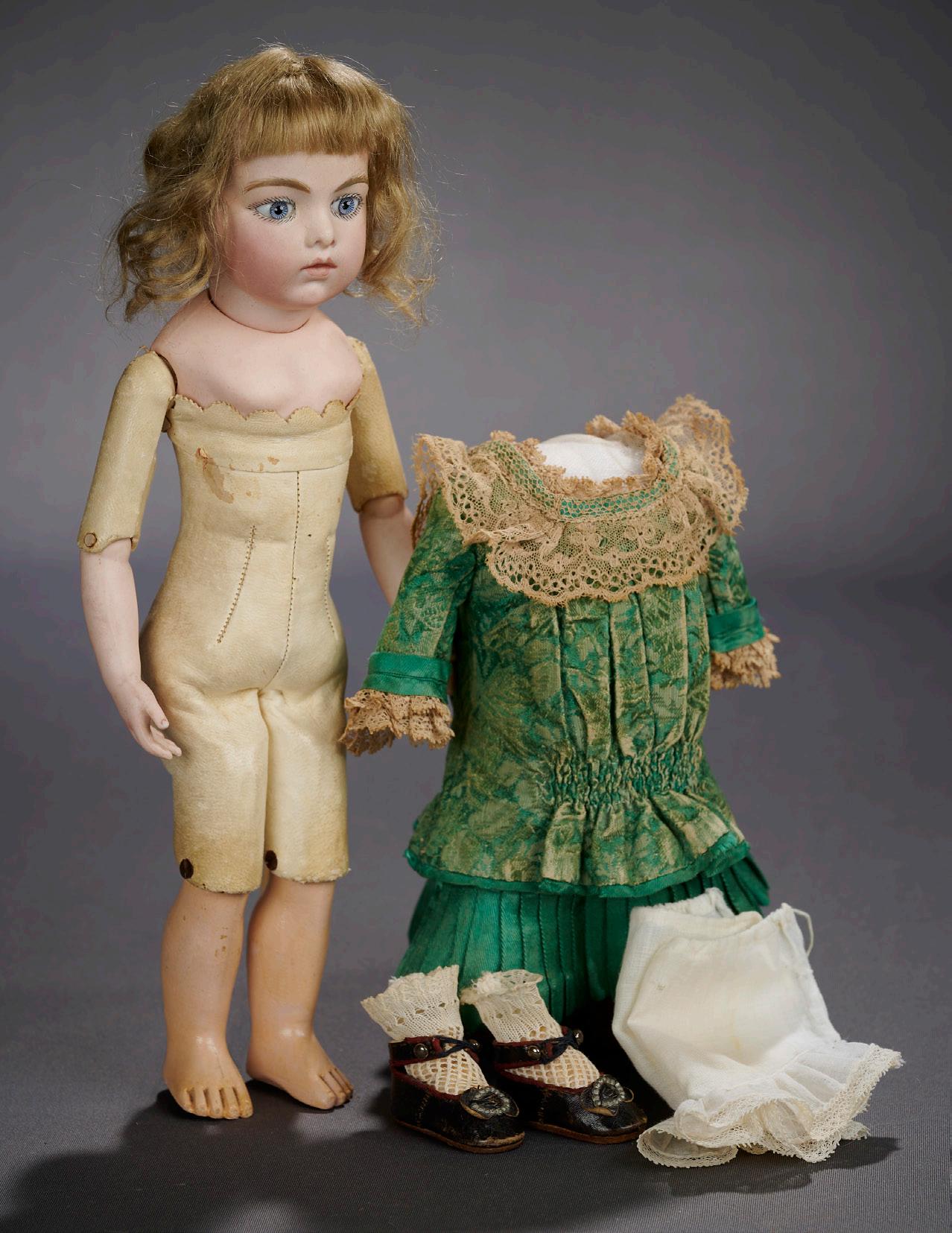 12” (30 cm.) Bisque swivel head on kid-edged bisque shoulderplate with modeled bosom and shoulderblades, blue glass paperweight inset eyes with spiral threading, dark eyeliner, painted lashes and brows, accented nostrils, closed mouth with accented lips, pierced ears, brunette mohair wig over cork pate, slender kid bébé body with Chevrot hinged hips, wooden lower legs, kid-over wooden upper arms, bisque forearms. Condition: there is restoration to the forehead and extending to repainting of lashes and brows on the right side, shoulderplate and bisque hands perfect, body original and fresh. Marks: Bru Jne 2 (head) No.2 Bru Jne (shoulderplate). Comments: Leon Casimir Bru, circa 1884. Value Points: desirable petite size, included is original green patterned silk dress with lace trim, pantalets, socks and leather shoes with silver buckles impressed “Bru Jne Paris 2”. $4000/6000