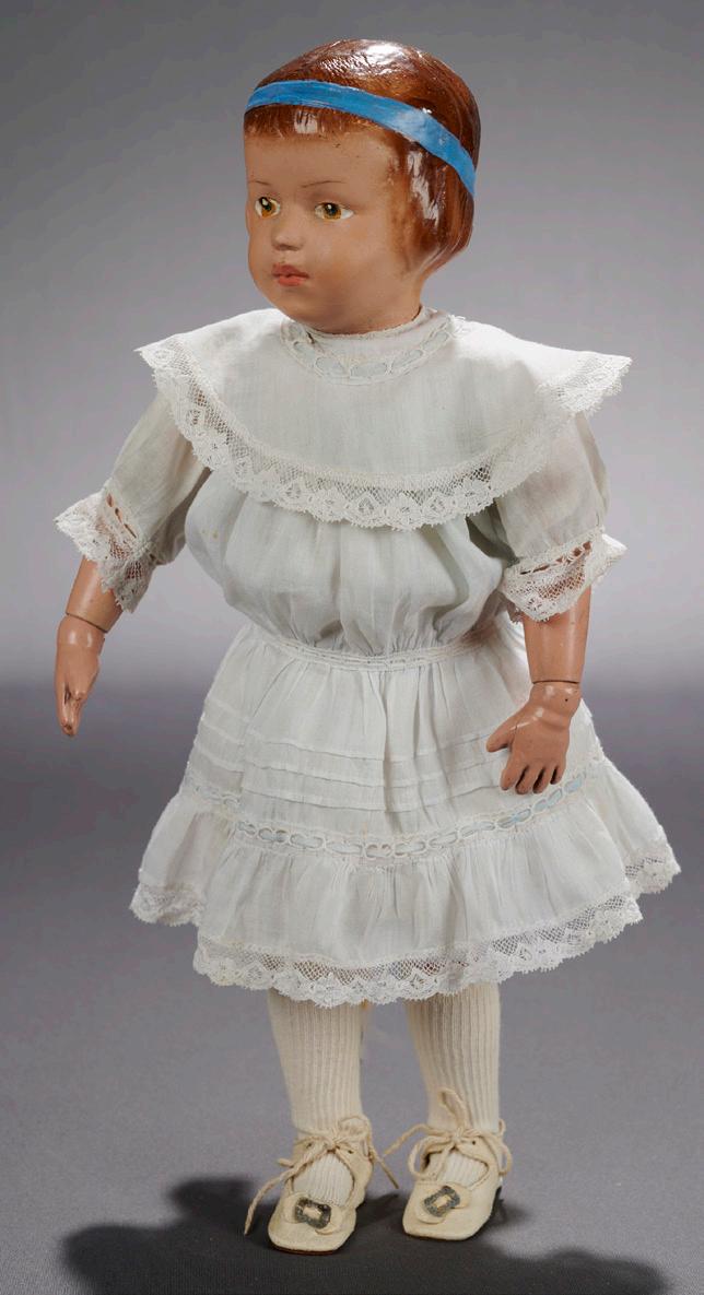 14” (36 cm.) Bisque socket head with slender heart-shaped face and elongated throat, blue glass sleep eyes, painted lashes, singlestroke brows, accented nostrils, closed mouth with center accent line, brunette mohair wig, composition and wooden slender body with elongated limbs, nicely costumed. Condition: bisque excellent, body original, left ankle restored, hands restored. Marks: 1469 C&O Dressel Germany 2. Comments: Dressel, circa 1915. Value Points: sought-after model with beautifully-shaped face, gentle expression, original body. $1200/1600