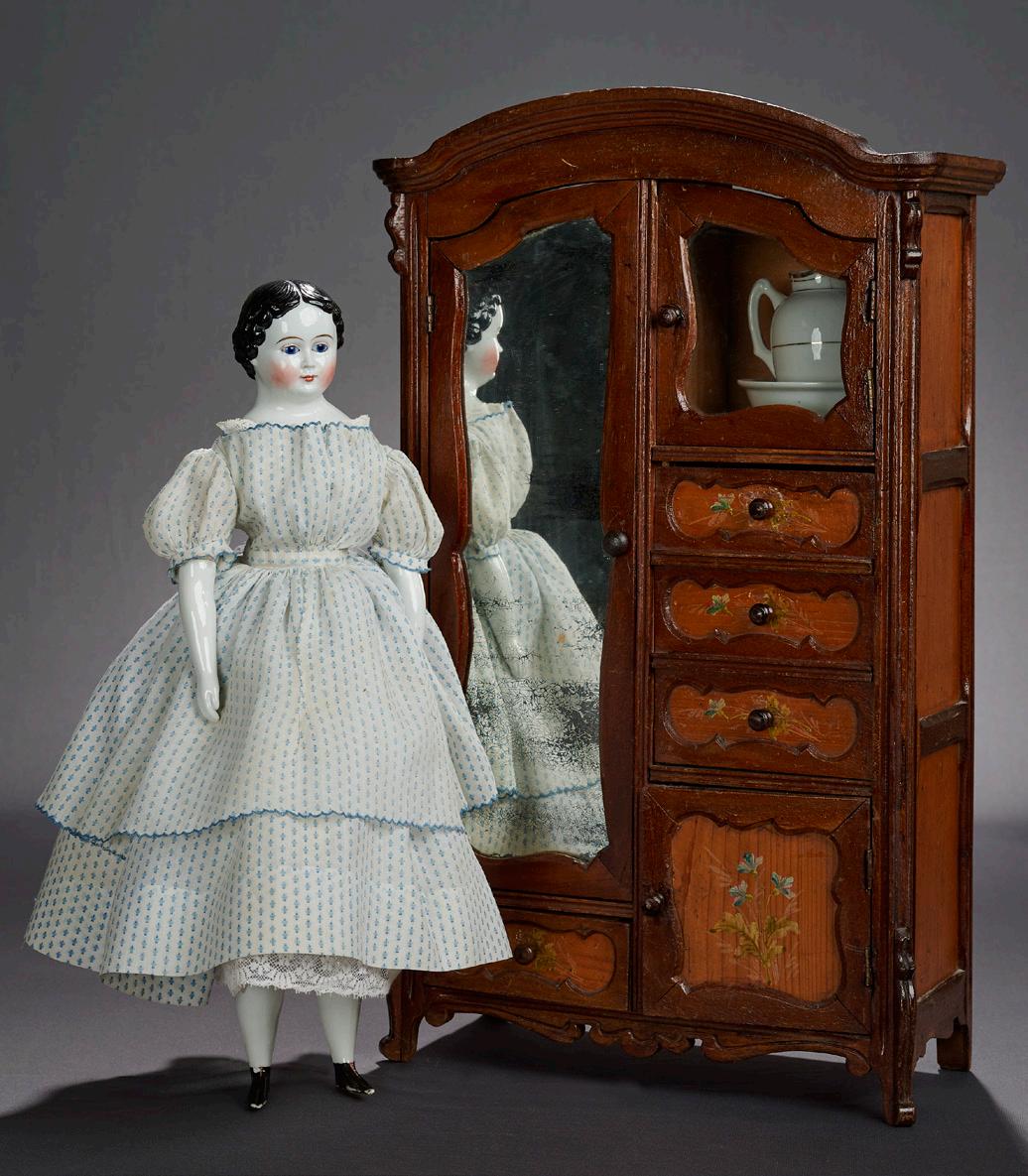 22” (56 cm.) h. armoire. 13” doll. The wooden armoire with ogeeshaped arched crest features paneled double doors with ornate brass hardware, (key included) and lower drawer; the cabinet is fitted with antique linens tied with rose silk ribbons, and antique bébé undergarments are originally-pinned to the inside of doors. Standing in a fitted cubicle of the armoire is a bisque head doll with blue glass eyes, painted lashes and brows, open mouth, row of tiny porcelain teeth, brunette human hair wig, French composition and wooden fully-jointed body, original costume. Condition: generally excellent. Marks: (anchor mark) 1 France. Comments: for the French market, the fitted armoire appeared in Paris Etrennes catalogs of the era, circa 1910. Value Points: fine cabinetry work of the armoire enhanced by its fitted contents. $900/1300