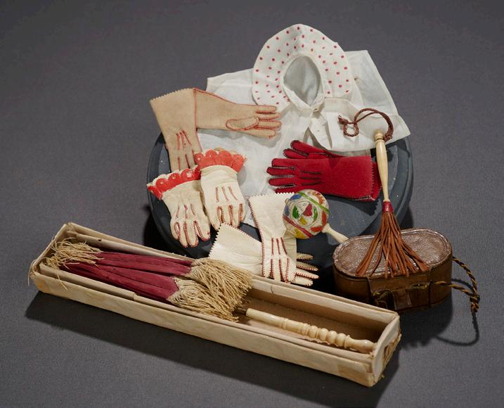 Above: Petticoat, silk slippers, bi-corn hat; Left: Necklace